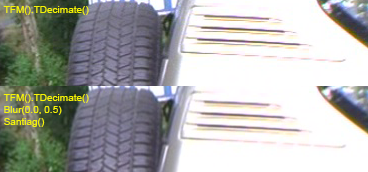You can see that the blur in the code does make it blurred slightly (details in the grass, tail light and tire for example, have degraded). Is this the Anti-Aliasing degradation from the filter that Manono mentioned before? If so, I think I might stick with TFM().TDecimate() and not TFM().TDecimate() Blur(0.0, 0.5) Santiag(). Thank you though! I've learned something, and I really appreciate that.