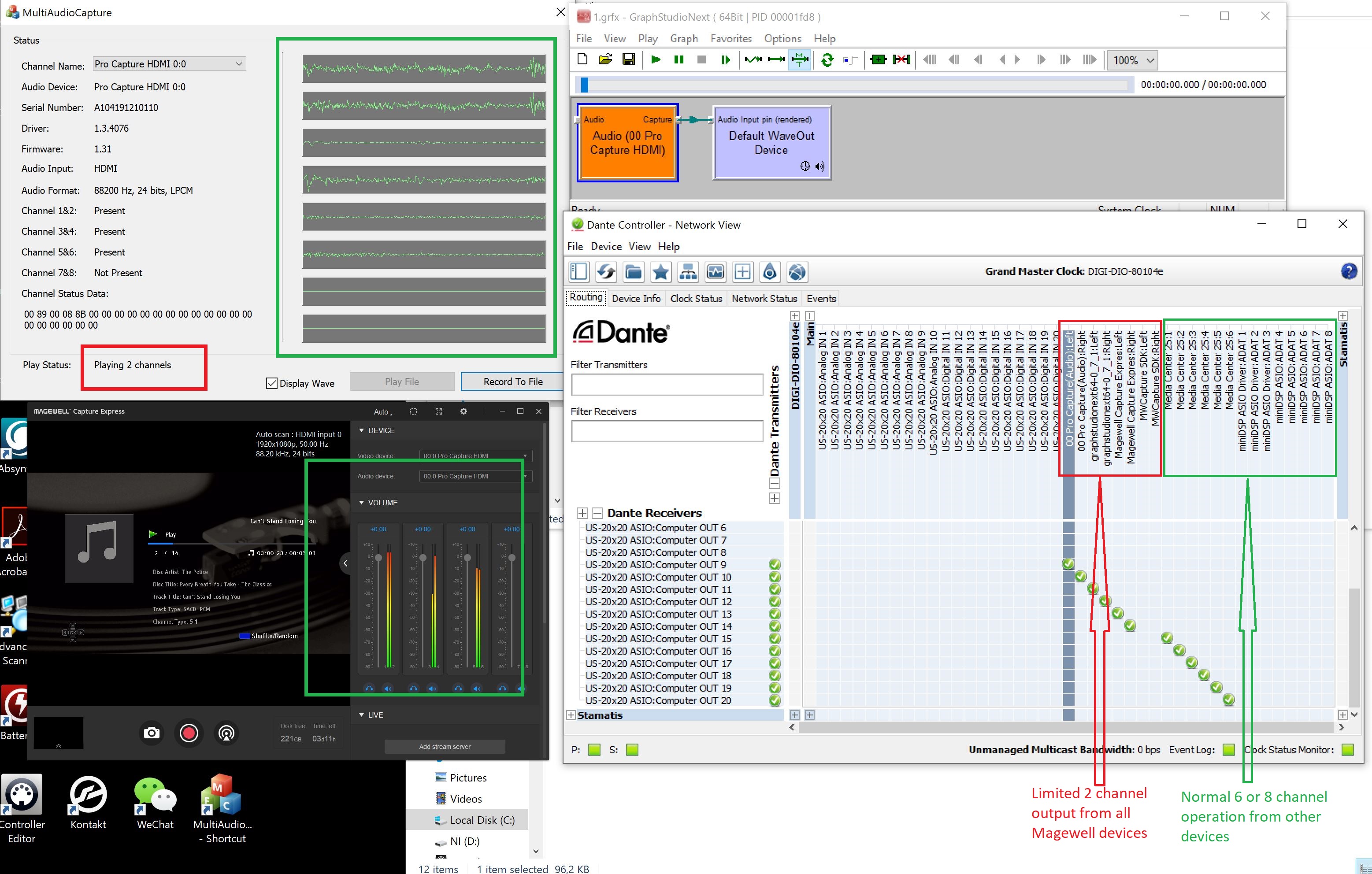 • I don’t have a Magewell usb dongle so I can´t test it. However consulting the specs for the Magewell usb devices it seems they only support stereo recording they don’t seem to support multichannel and they do seem to also be limited to 24 bit / 96 Khz. To get multichannel audio and 32 bit / 192 khz audio you do have to use the Magewell Pro Family (PCIe Gen2 ) cards.They do have a different main chip on board.