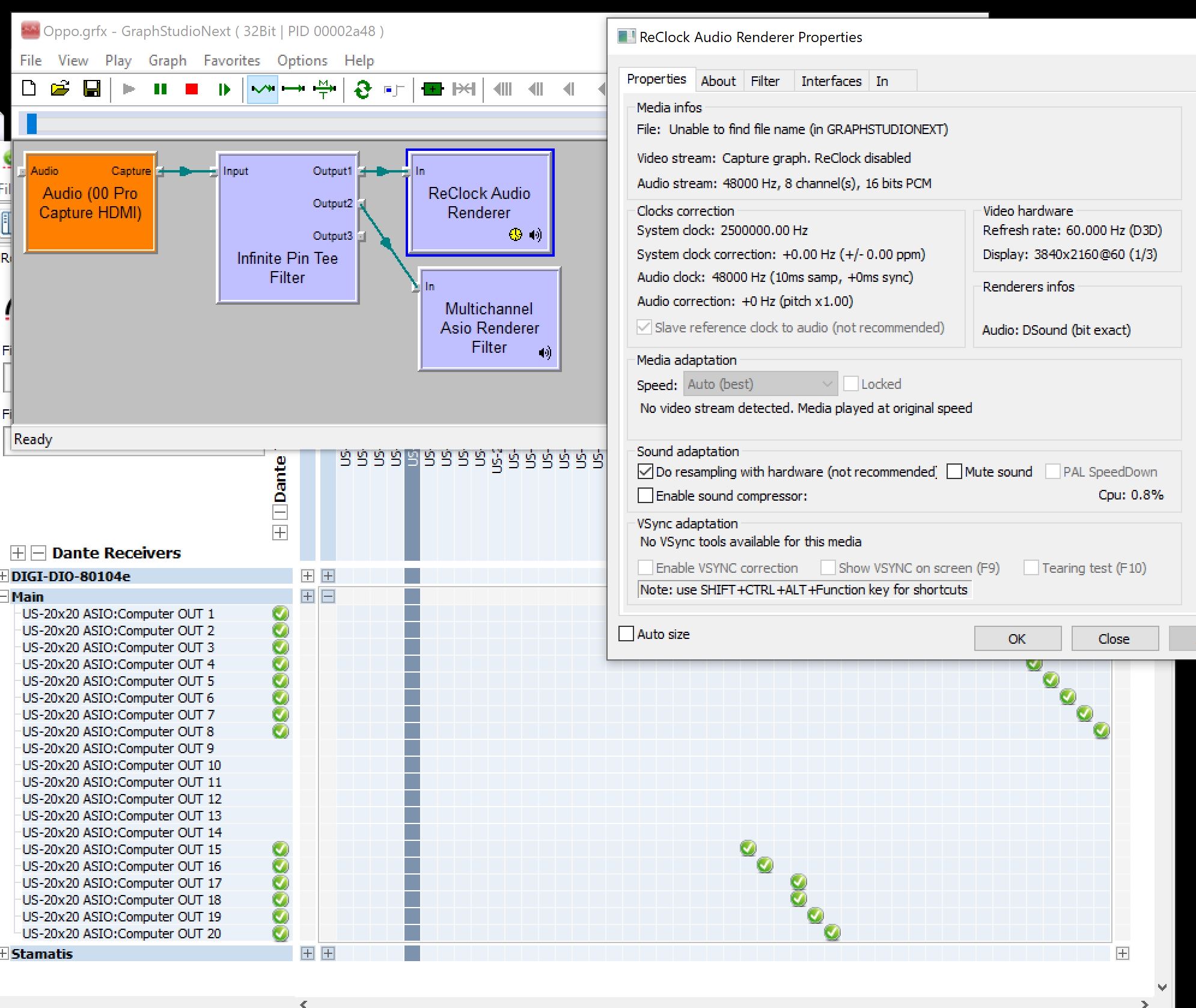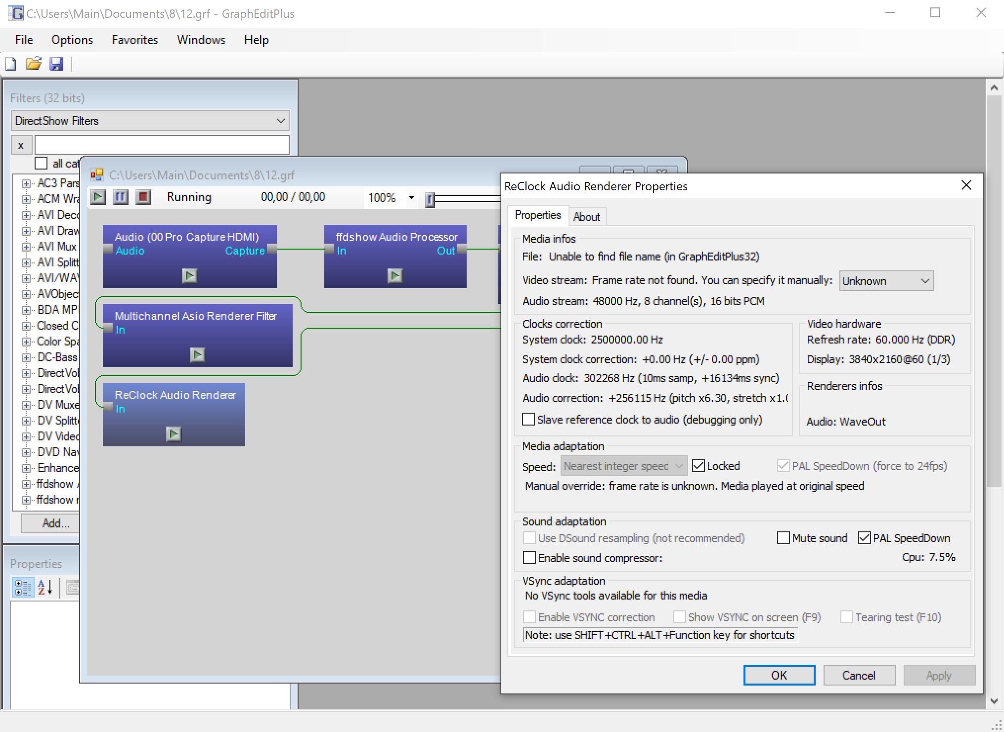 Stop and restart the filter in Graphstudionext and you have perfect sound/channel separation/phase, until the point that small repeated clocking errors are being accumulated with all the unwanted results. This point is not specific. Could take 2 minutes of operation, sometimes 10 minutes of operation or more.