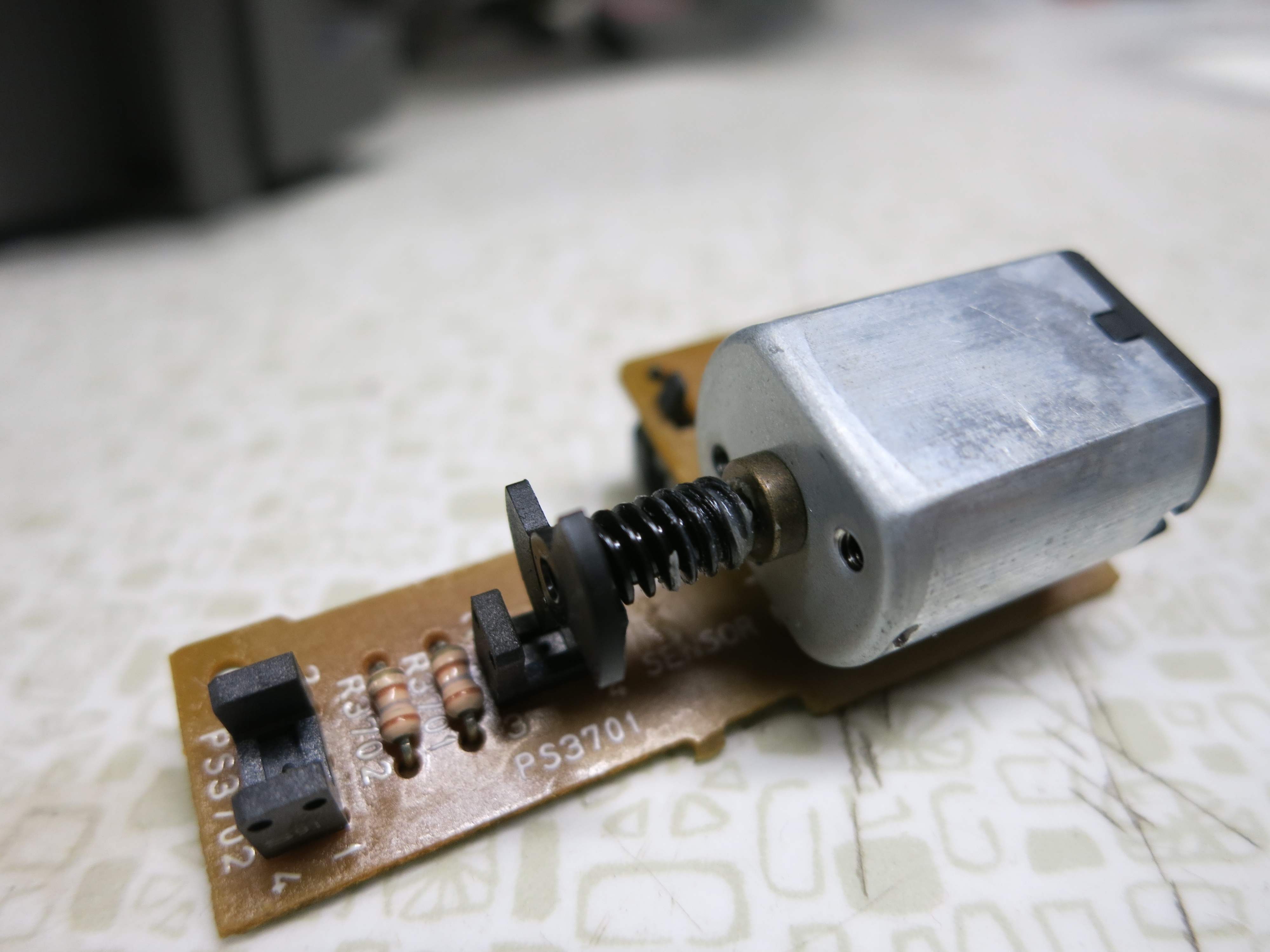 Knowing that the VCR would never operate without the motor (and optical sensor), I decided to pull the shaft and worm gears out and let the motor free run with no load of the gear train. Sadly this had absolutely no effect on the operation. While I do now hear the whir of the motor, the VCR still times out at 3 seconds and shuts down.
