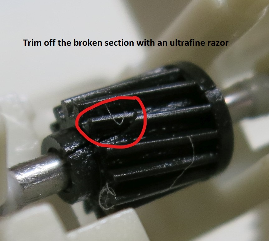 I used a very fine razor (Feather surgical blade #11) to trim down the broken half of the tooth of the gear so there would be less moving plastic to bind up the motor. Be careful not to damage the gear teeth on either side!