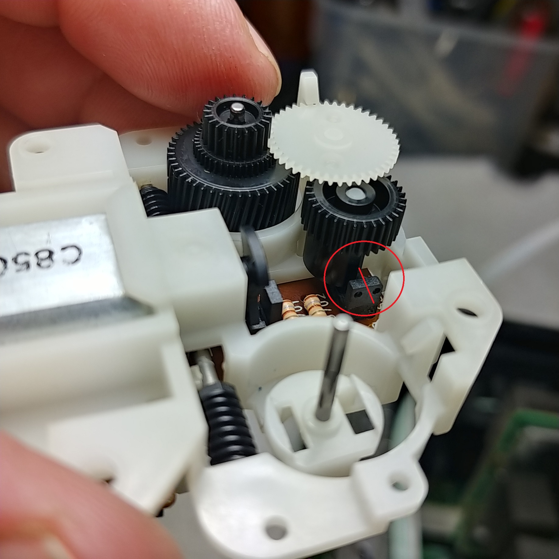 Then I greased and put everything back together, leaving out all unused gears. It is important to get everything aligned correctly- the two sensors that give gear movement feedback have an initial starting position. The one that senses the motor shaft is completely blocked, while the one that senses gear motion is halfway blocked (see attached pic). I've circled the gear, and marked how the half circle blocks half of the sensors.