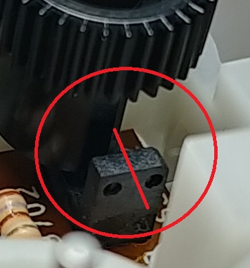 That way, you can easily adjust the main drive gear and test with power cycles. After turning the motor shaft to adjust, be sure to reset the sensor gear to occlude half of the sensor, as pictured above.