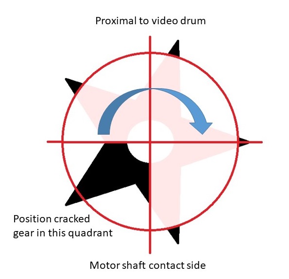 When the VCR powers up, it initializes the DD by spinning the motor clockwise (which means the worm gear is turning clockwise... it gets confusing) just enough to move the gear sensor 1/8th of a turn so it blocks both sensors, then it moves back to the original position. The secret is it only turns the cross worm gear shaft 3/4 of a turn to do this. So I reasoned that if I positioned the broken tooth in this 1/4 section that is not touched in the initialization sequence, it would not jam the motor. And that is exactly what happens. I've tested it extensively, and empirically determined the optimal position for my cracked gear. When looking down the worm gear axis, it should be in the lower left quadrant (see drawing).