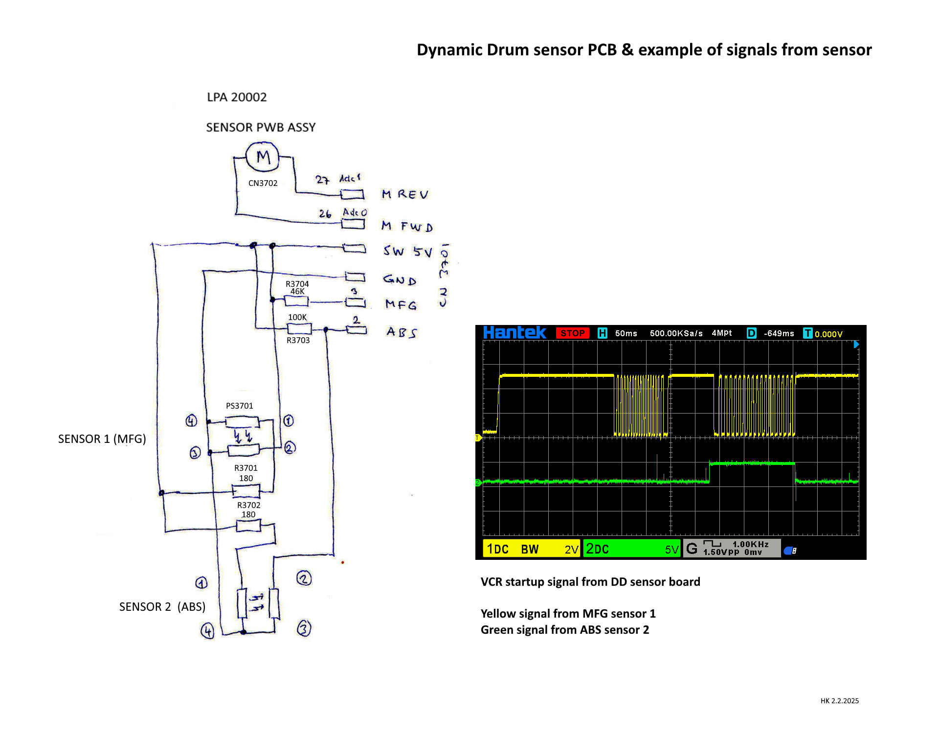 I have attached picture showing hand drawn circuit diagram of DD gearbox board (it is not available in service manuals). Also, as an example, startup signals from oscilloscope. When motor turns, the photosensors are cutting 5V input from SW5V terminal to MFG and ABS terminals. Both terminals have voltage status of either 0V or 5V.