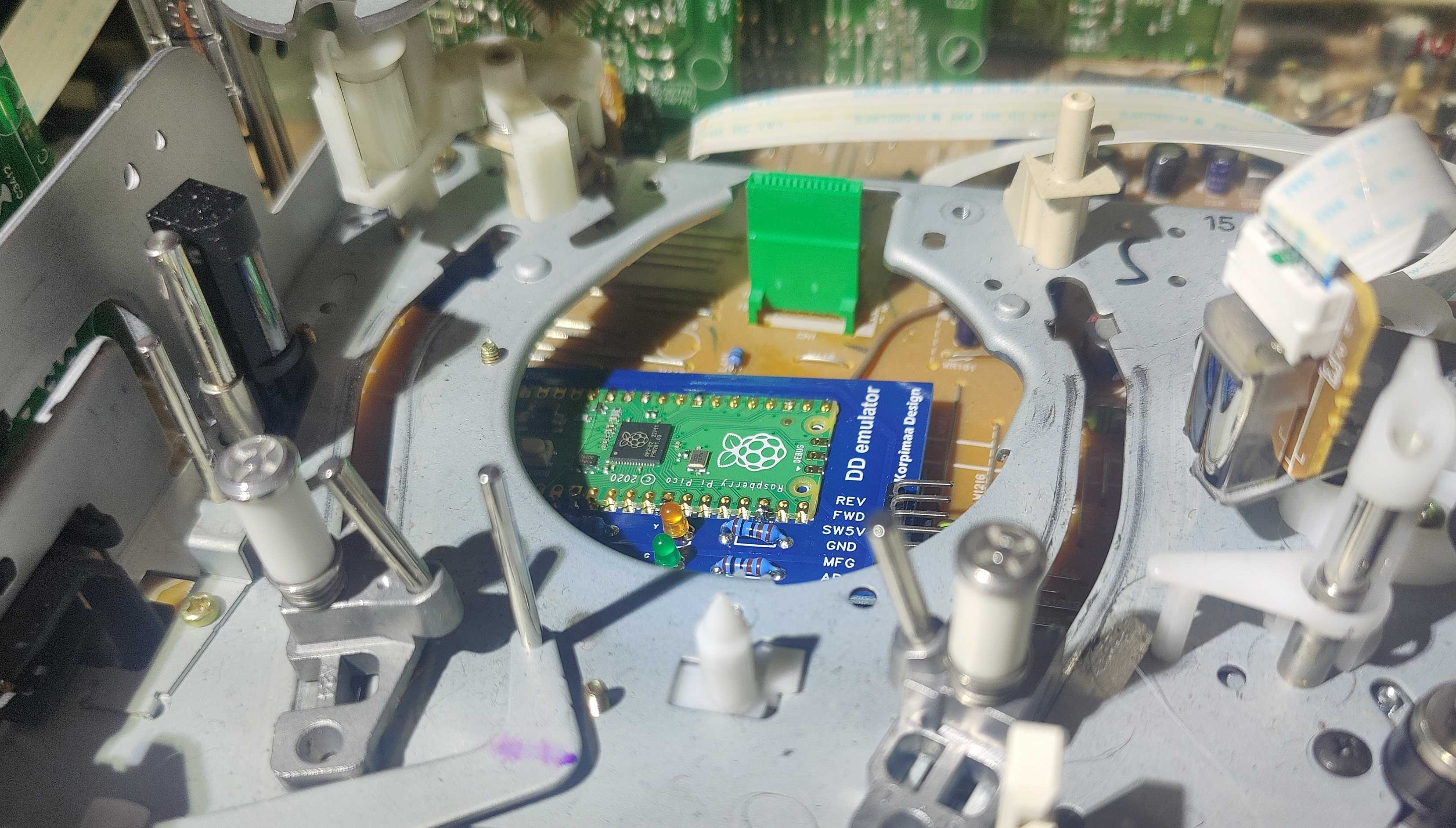 In my long message yesterday, I said, that 'DD emulator' could be mounted directly to main board socket CN3501. I made rough feasibility study of available space and it looks OK. This applies to my HR-S9700, but I think (?) other models don't differ much on that location. The current pin header in 'DD emulator' is 6 pins / 2.54mm pitch. CN3501 requires 6 pins / 2.00mm pitch. On next revision of PCB I will add this direct mounting option. I also need to reverse order of terminals REV/FWD/SW5V/GND/MFG/ABS. For direct mounting ribbon cable is no longer needed. See below foto of 'DD emulator' placement under video head drum. Disadvantage of this mounting option is, that it will occupy the space of DD gearbox.