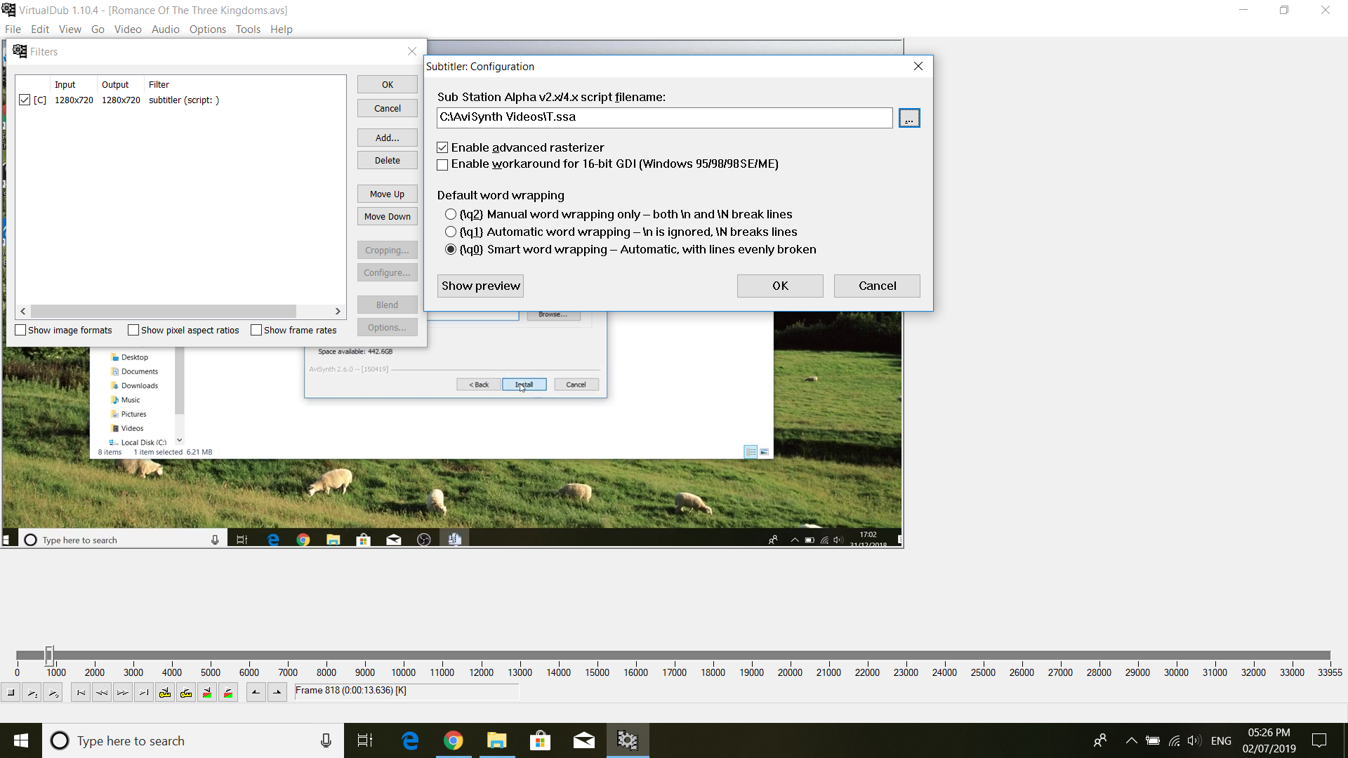 14. I know this is an old thread, but I chose to import my subtitle file with AviSynth instead of VirtualDub. I use VS filter to import srt file, but the problem is that the subtitle doesn't show up when I import ssa file. Is there any problem with that?