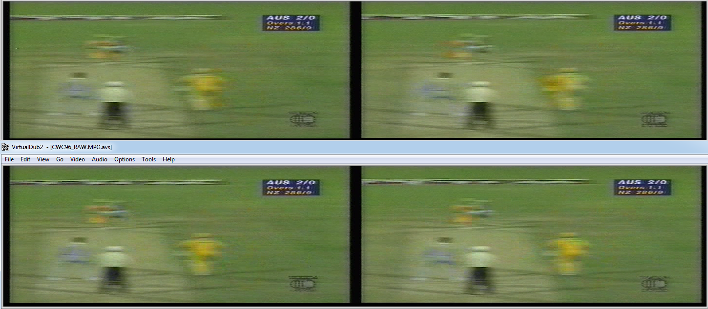 On the top is VirtualDub with the Deinterlace -> Unfold Fields Side By Side option. On the bottom is the equivalent with AviSynth. You can see that the colors are aligned with the luma properly with AviSynth. Also, if you zoom in, you'll see comb artifacts in the colors in the VirtualDub image, not in the AviSynth image.
