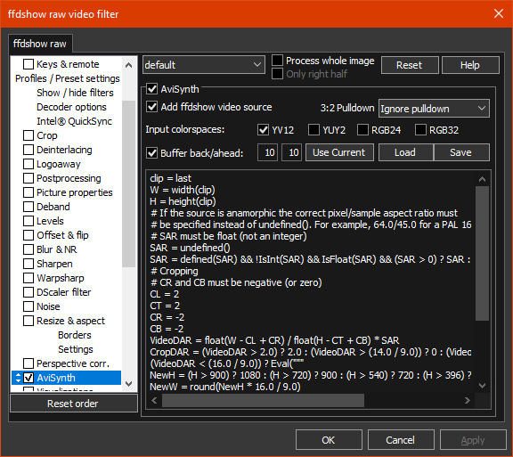 The versions attached to this post require a change to the ffdshow script in the second post. I fixed the check that CropDAR is specified as float. It means when a CropDAR of zero is specified (the same as an undefined CropDAR) it must also be float. So for this line....