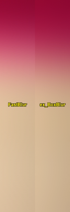 Code:# Some 720p source Cropped = Crop(width()-32,0,0,0) A = Cropped.FastBlur(32,72,3, true).GaussResize(120,720) B = Cropped.ExtractY().ex_BoxBlur(32-1,72).ex_BoxBlur(32-1,72).ex_BoxBlur(32-1,72) C = Cropped.ExtractU().ex_BoxBlur(16-1,36).ex_BoxBlur(16-1,36).ex_BoxBlur(16-1,36) D = Cropped.ExtractV().ex_BoxBlur(16-1,36).ex_BoxBlur(16-1,36).ex_BoxBlur(16-1,36) E = CombinePlanes(B,C,D, "YUV", pixel_type="YUV420P8").GaussResize(120,720).ConvertBits(16).GradFun3Plus().ConvertBits(8, dither=0) StackHorizontal(A.Subtitle("FastBlur", align=5), E.Subtitle("ex_BoxBlur", align=5))
