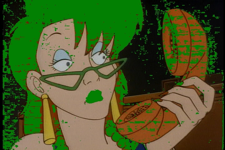 Looks like slimer on her head . (Yes I know, the green is just visualizing the mask) . (Yes I know, the green is just visualizing the mask)