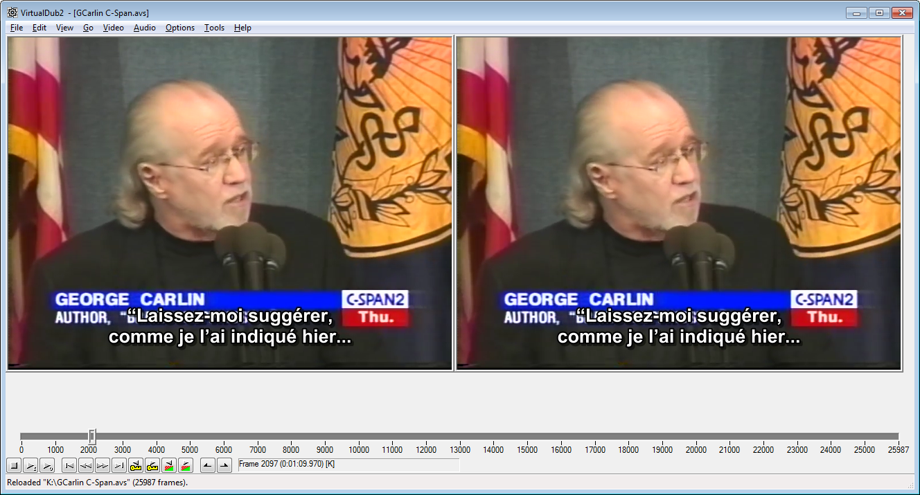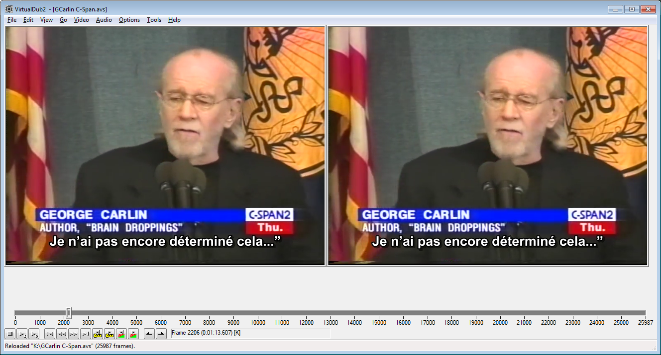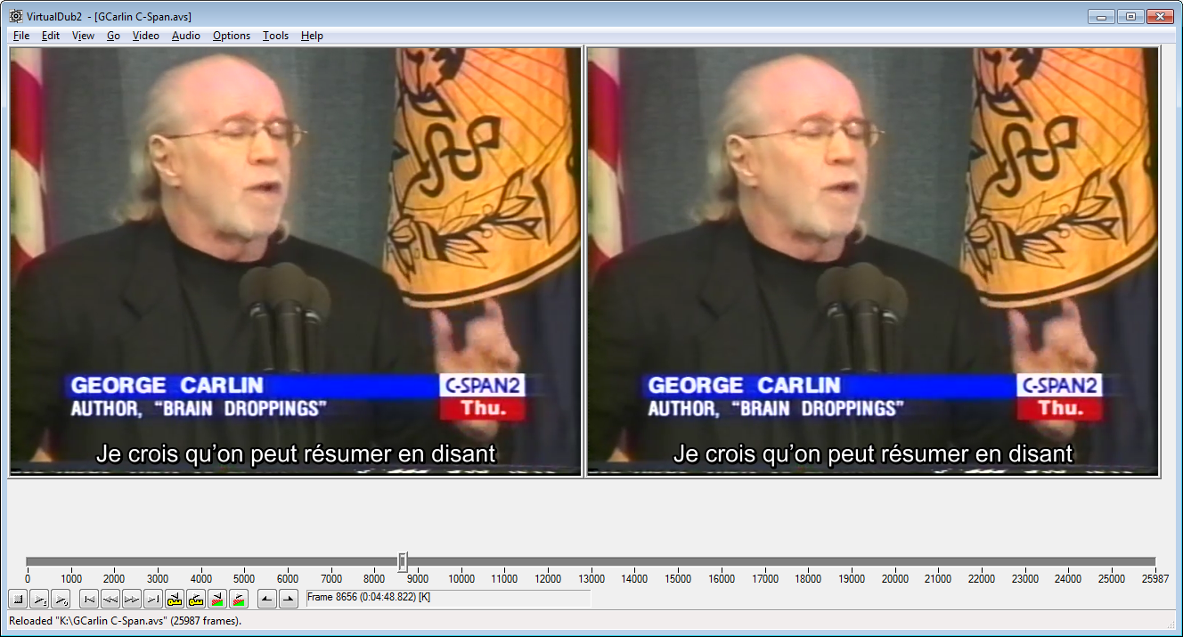 If I use Avisynth's TextSub(), the subtitles (created with SubtitleEdit in SRT format) appear with a pleasant style, but are positioned partially over that strip, which affects their readability. I found a way to change the position of the subtitles by creating a .srt.style file (based on the template found in this thread) and setting the “MarginV” field to a suitable value. It works, but then, the margin is the same for 1 line subtitles as for 2 lines subtitles, whereas by default the subtitles are vertically centered, so that the 1 line subtitles appear in the middle of the lines of 2 lines subtitles, if that's clear enough.