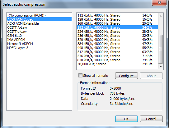 A wanted to try VirtualDub2, but the AC3 ACM encoder juts isn't working. It doesn't even set the parameters I've adjusted, so every time I reopen Audio->Compression it's back to the default "empty" stage.