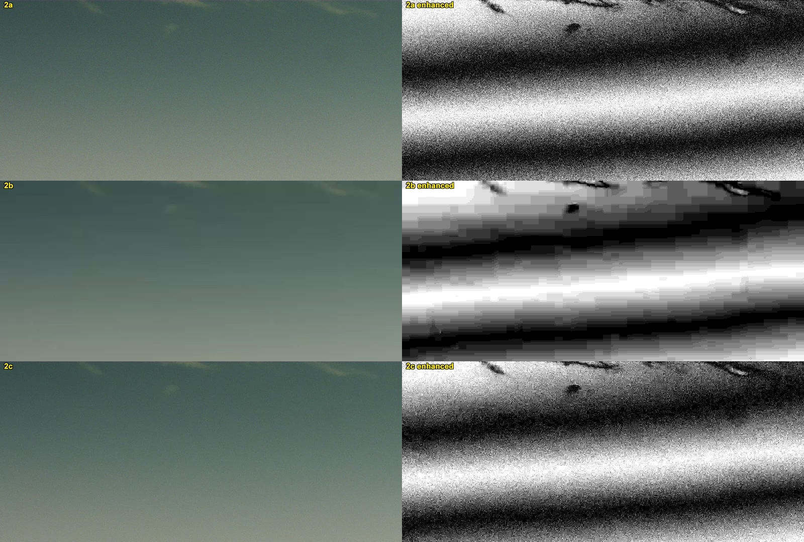 Notice in 2b, the macroblock edges are enhanced, easier to see. Now correlate those areas with the real image. Again, it would be "nicer" if you could do the fast switch, because of the "superimposed" split second residual memory . 2c should look more similar to 2a, than 2b . The grain/noise pattern is preserved better. You should be able to see that better in the "enhanced version" .