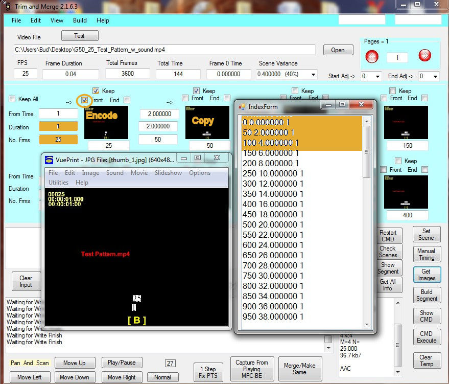 To COPY the following segment from the Key Frame at Frame 50, you would use:Code:ffmpeg -i "C:\PathToVideo\G50_25_Test_Pattern_w_sound.mp4" -ss 1 -t 1 -c:v libx264 -c:a copy -y "C:\OutputFolderPath\0_0_G50_25_Test_Pattern_w_sound.mp4"
