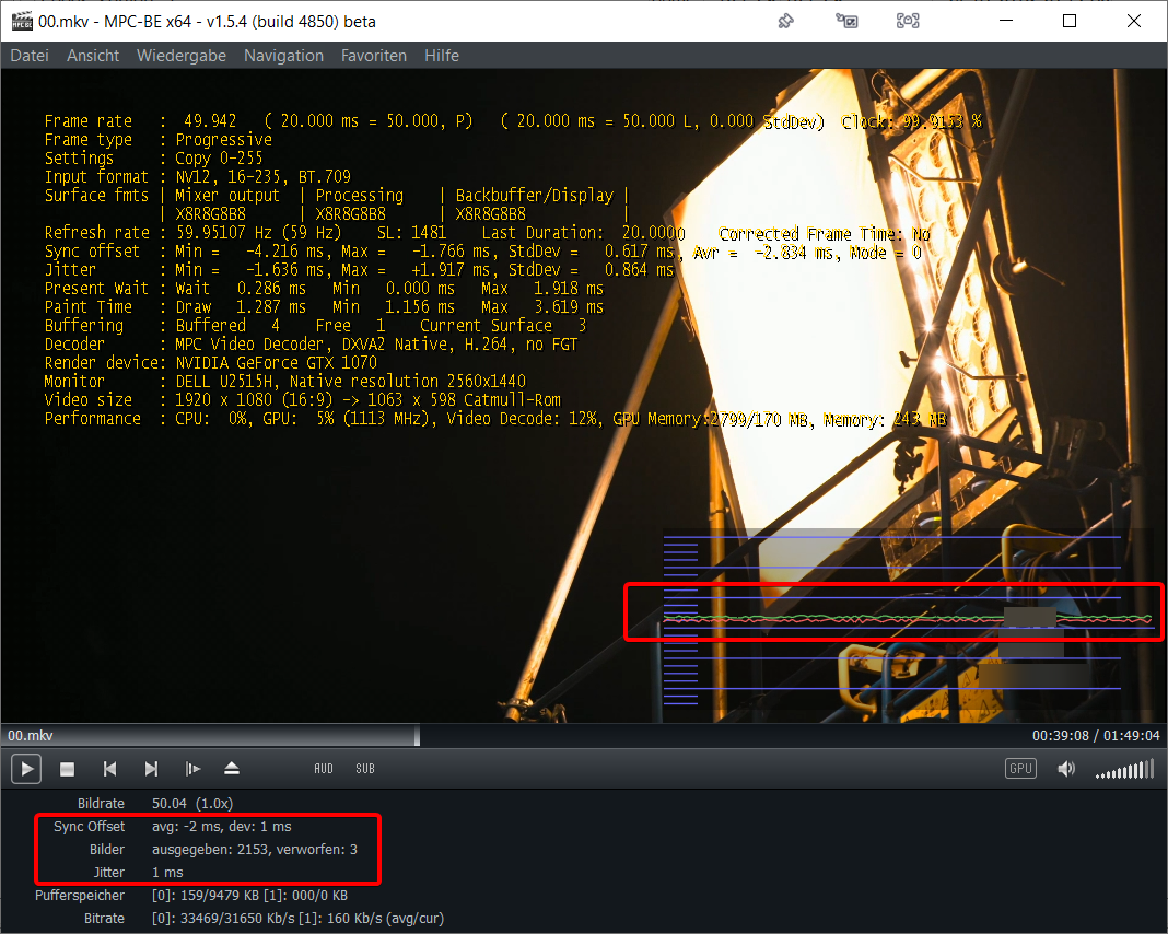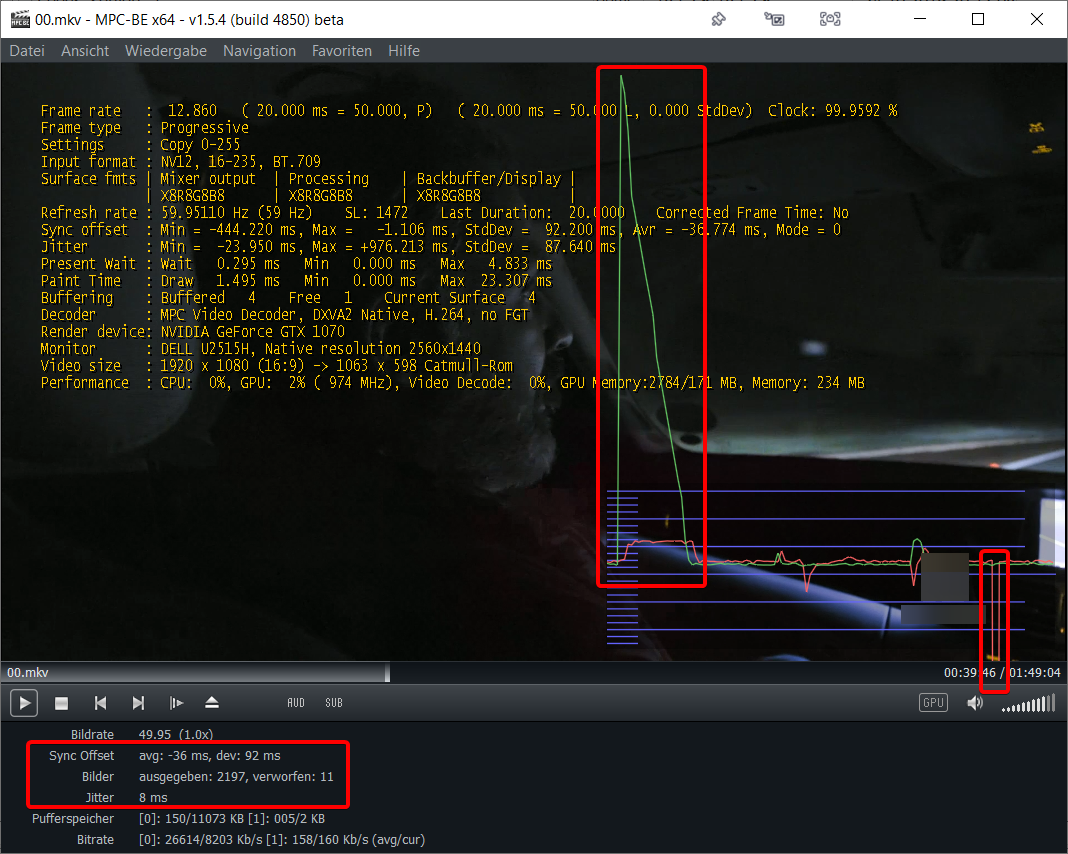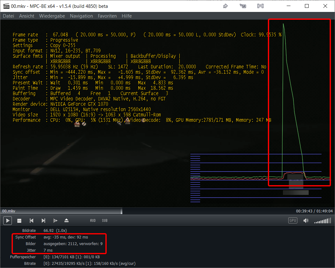 Yes, I know that MPC-BEs statistics are based on timing. "The graph shows how much the audio/video timing differs from the ideal situation" - but nevertheless the graph is always showing big spikes when there's an error in the video that I want to detect. I don't know what causes these timing errors.