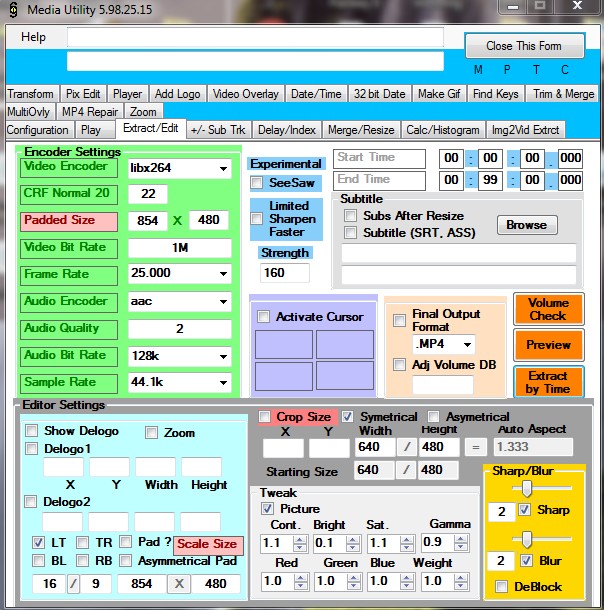 The above takes a 640x480 video, within 0-99 minutes, Blurs it, sharpens it, Final processes it (bright, contrast, gamma. colors,etc, scales it,sets display aspect, quality and frame rate.Code:ffmpeg -i 'C:\Users\Bud\Desktop\G50_25_Test_Pattern_w_sound.mp4" -ss 00:00:00.000 -to 00:99:00.000 -vf smartblur=1:0.2:6,unsharp=5:5:0.25,eq=1.1:0.1:1.1:0.9:1.0:1.0:1.0:1.0,scale=854:480,setdar=1.779 -vcodec libx264 -crf 22 -r 25.000 -acodec aac -ac 2 -ar 44.1k -b:a 128k "C:\Users\Bud\Desktop\G50_25_Test_Pattern_w_sound__Edited_1.mp4"
