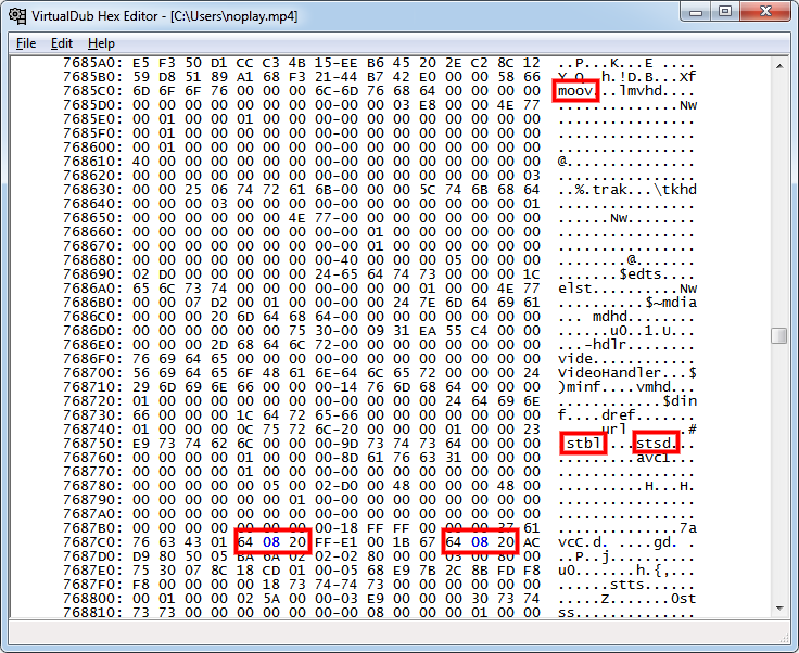 3) About 7 lines below "stsd" you'll see the sequence 64 08 20, twice, in the hex data. Change both 08 to 00.