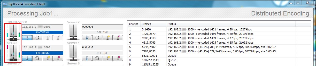 However, after the latest Ripbot update it's gotten worse as now the client won't even start encoding. It compiles the chunks list and then just sits there as "Qued" and nothing happens. Also, what's odd is that the port on the server used to be 1000 and now it says 1003 for some reason when I never touched it and looks like it's not connecting. On the master I also noticed a warning icon and clicked it, it says that it can't connect or that it couldn't disconnect gracefully or something of that sort.