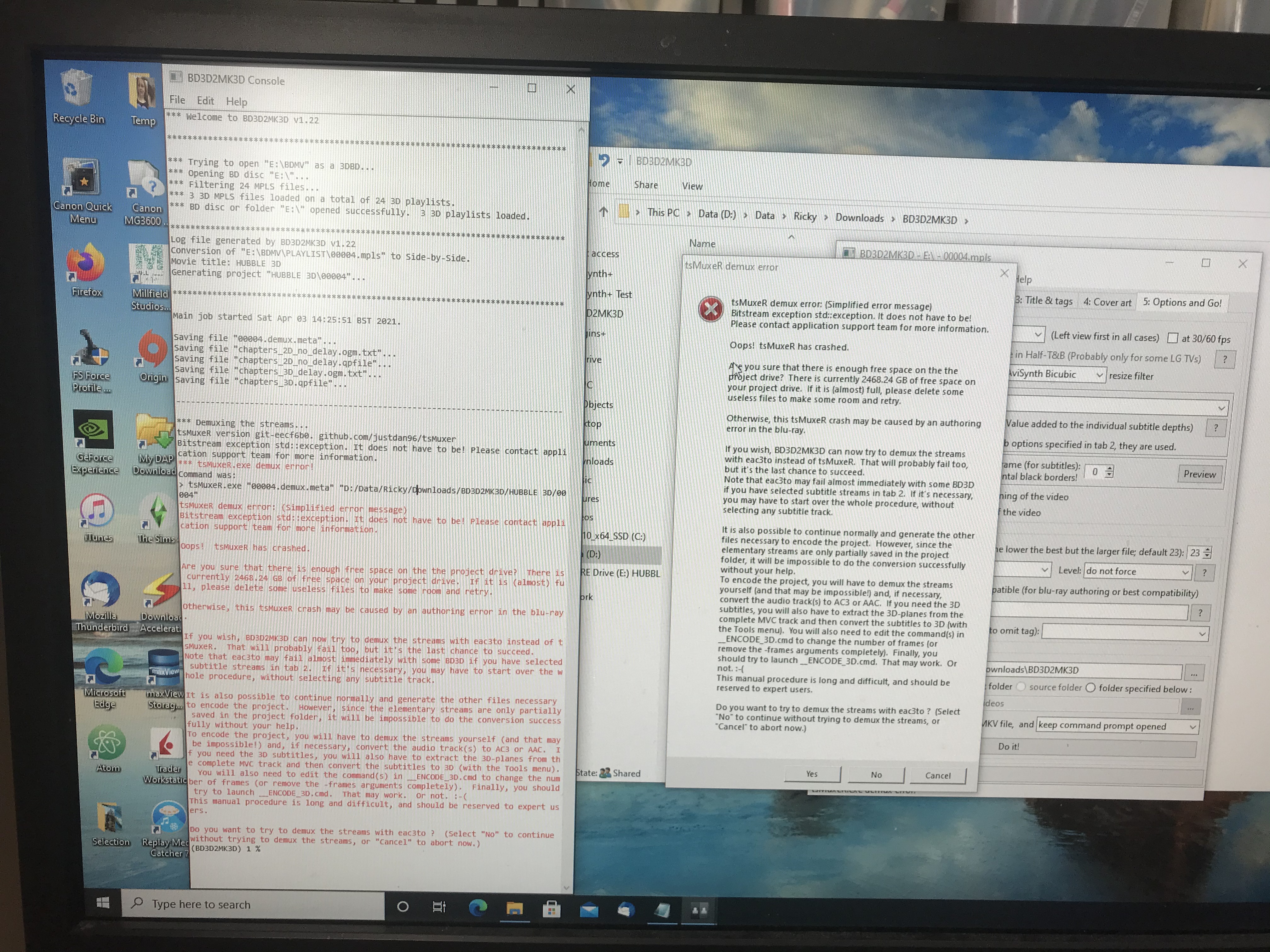 Last week I downloaded the latest version of your tool and tried to process two movies. Both failed for the same reason. Tsmuxer crashed. I was trying to process Hubble 3D and Star Trek Beyond in 3D.