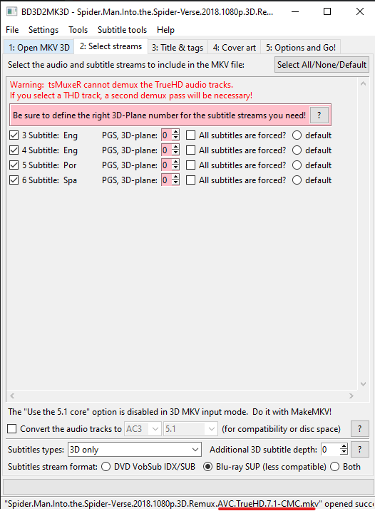In summary, if you want to keep the THD track, just ignore the warning, and let BD3D2MK3D do the two demux passes. Otherwise, be sure to select the DD stream in MakeMKV instead of or in addition to the THD track.r0lZ - PgcEdit homepage Hosted by VideoHelp (Thanks Baldrick)