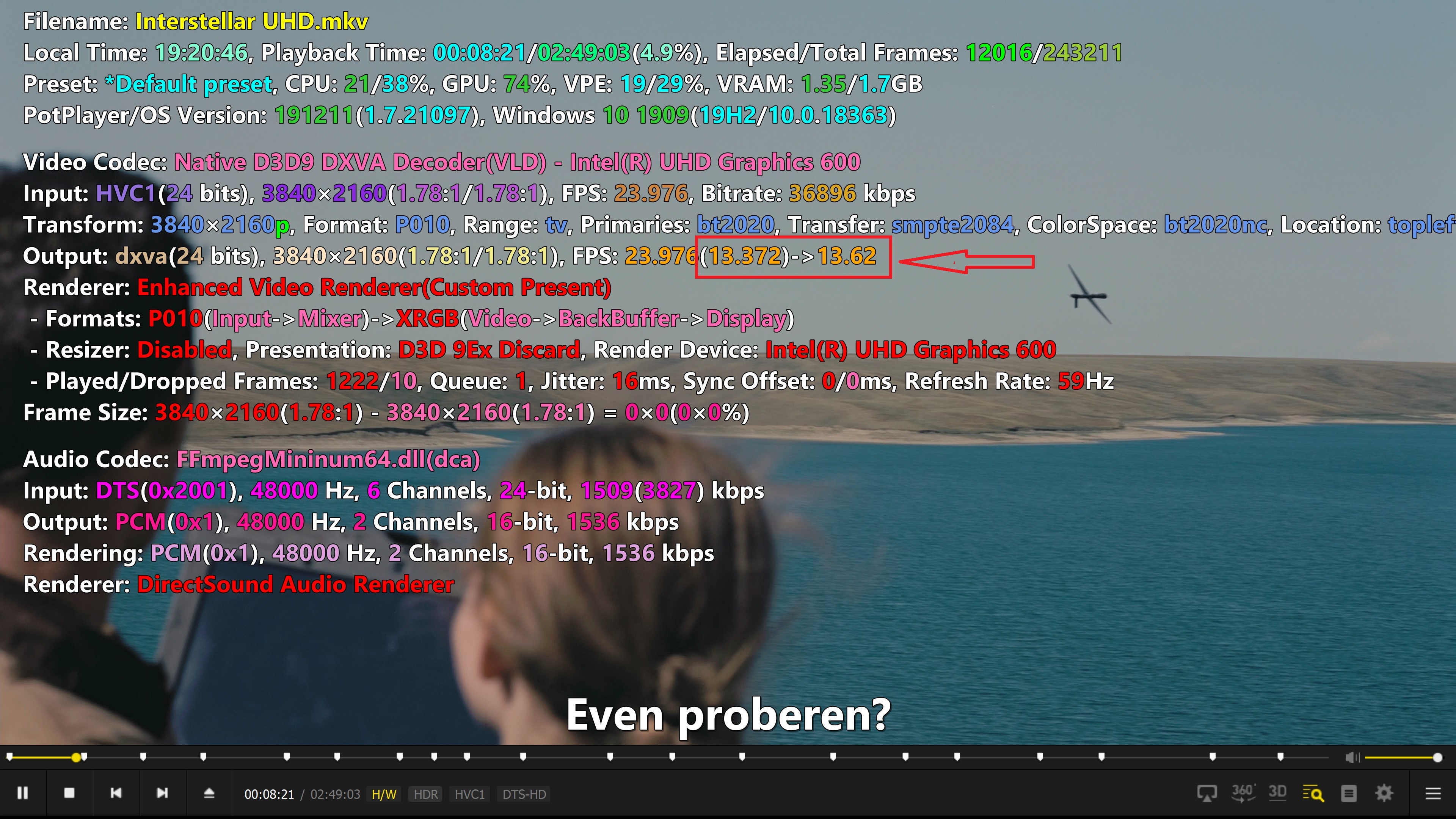 Now the problem is when playing a 2160p movie in MPC-HC I’ve got extreme judder. I tried several vids with several frame rates (23.976 - 29.97 - 59.94) al showing the same problem.