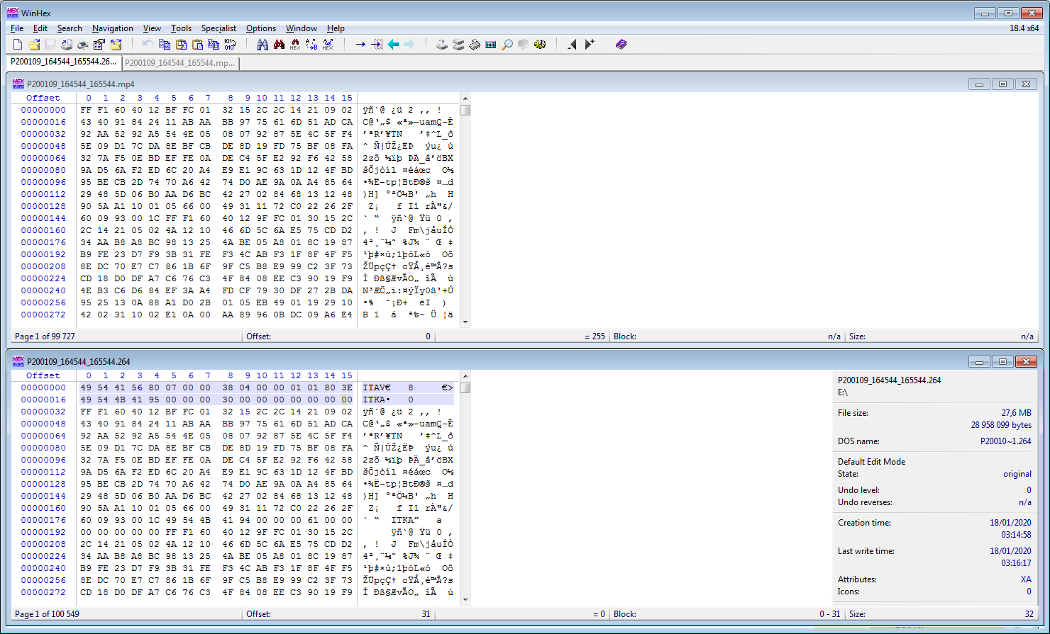 - if deleting 16 bytes starting from “ITKA”, the files are identical again, up until a “ITKV” string appears in the .264 file — apparently each video chunk begins with a 16 bytes header indicated by “ITKV” ;
