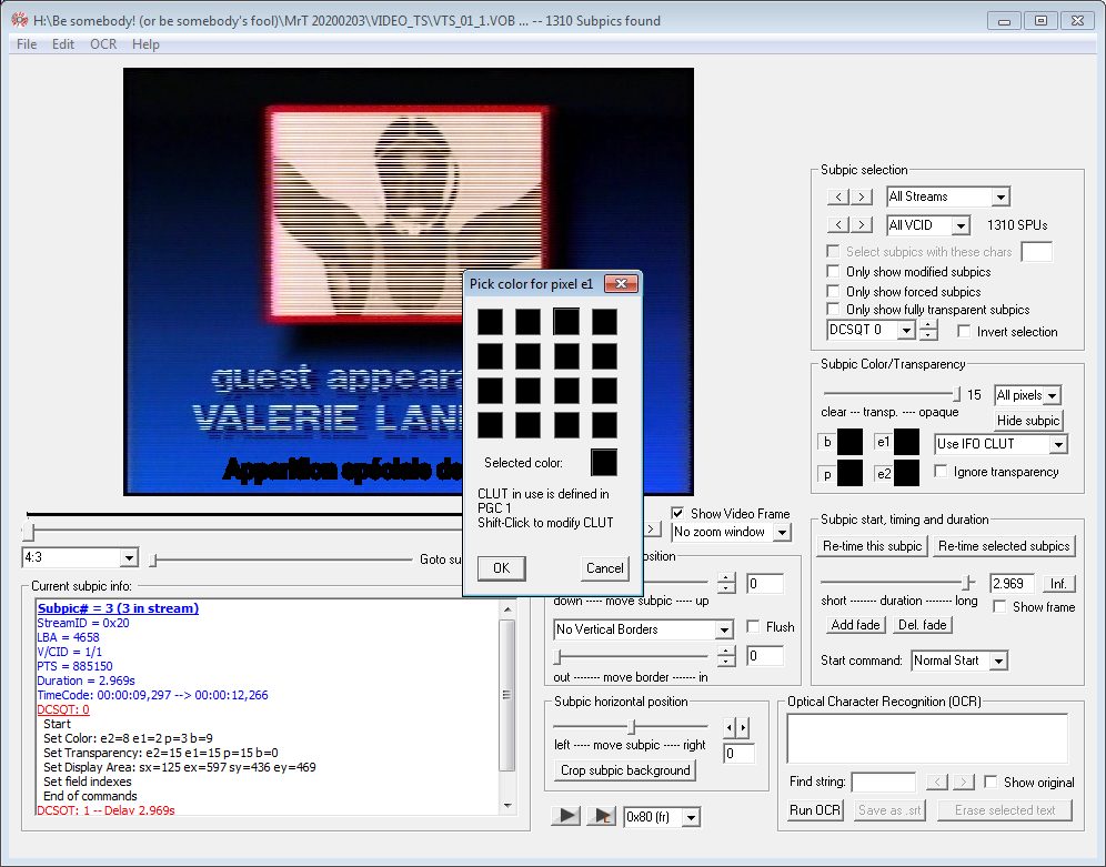 It's very weird because if I watch the individual VOB, the subtitles are displayed normally, but if I open the whole DVD folder and watch the same sequence from there, they appear in dark gray as shown earlier. What could possibly explain this ? Is there something wrong in the IFO files which could somehow reduce the number of colors of the bitmap images on playback, or replace a color with another ?