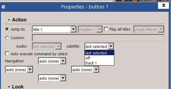 I've also seen this in the mean time, but I'm not sure I understand this — what does it mean here "in the Titleset domain / VMGM domain" ?Under "Action" for a button you select which subtitle track to use. Notice subtitle and audio is to be selected in the Titleset domain not the VMGM domain. (It's part of the specification for a video-DVD)
