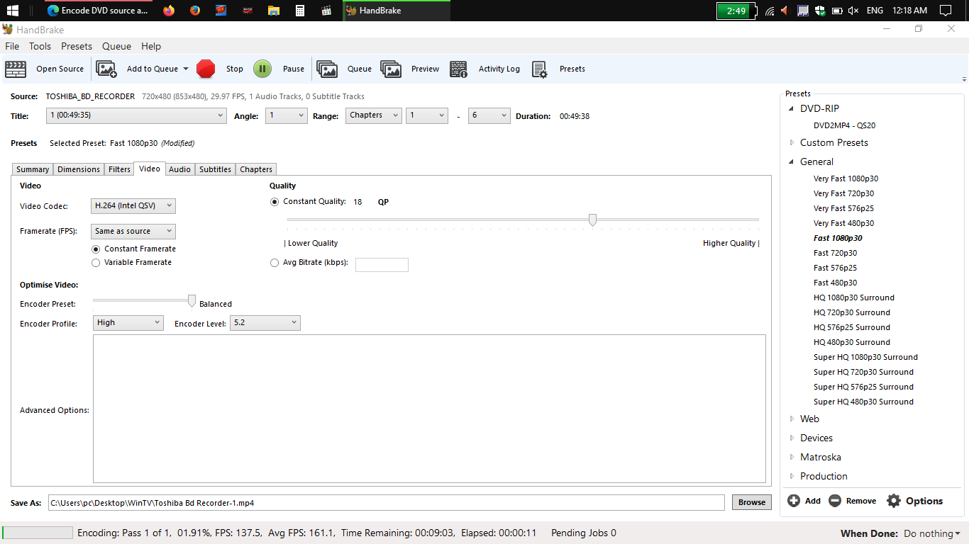 For example, if I was going to rip a 16x9 video, I'd use settings like this, with Quicksync to accelerate the encode. (Notice for the 49 minute video, it's reporting a quick 9 minutes to RIP and encode!Last edited by babygdav; 21st Jan 2020 at 02:19.