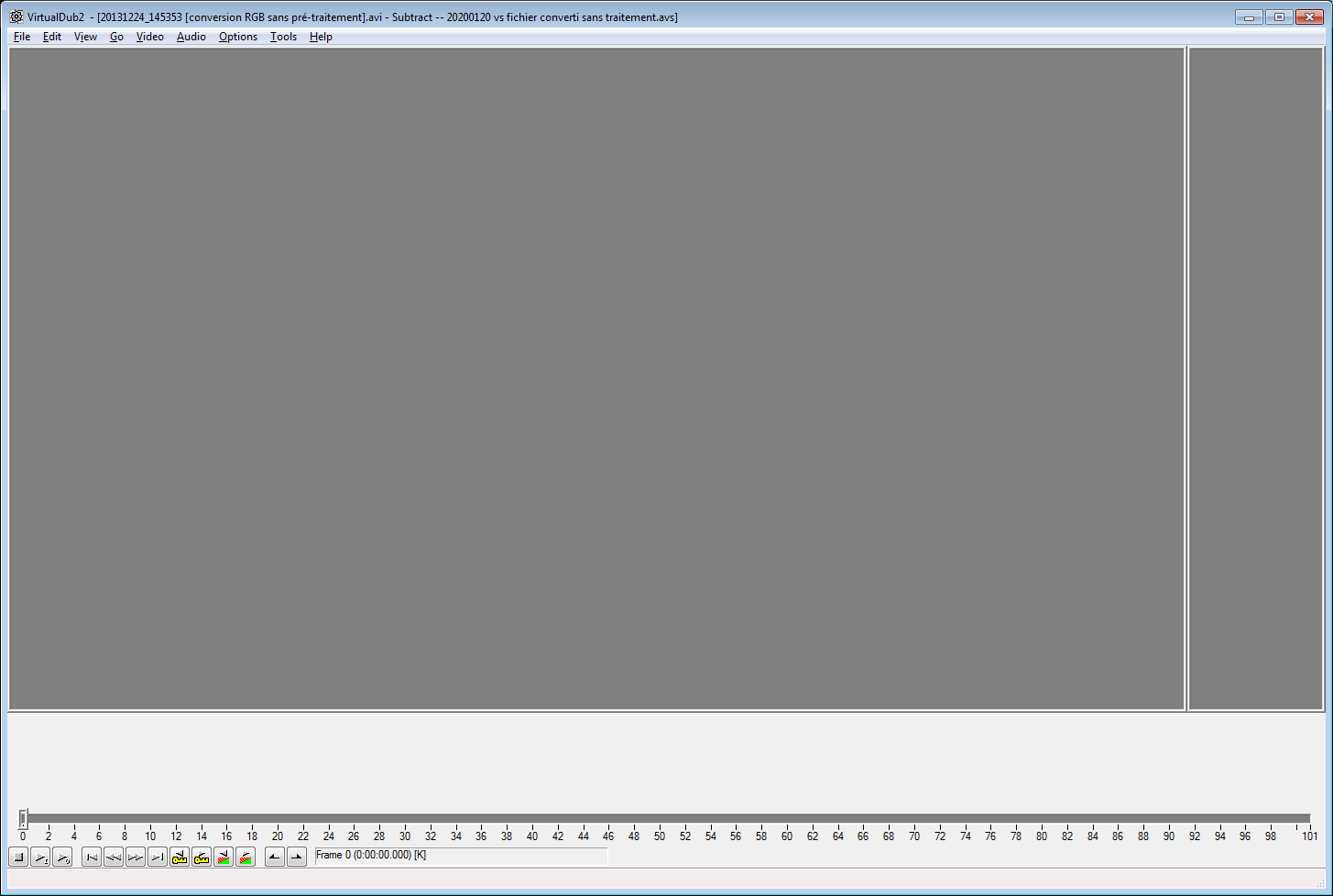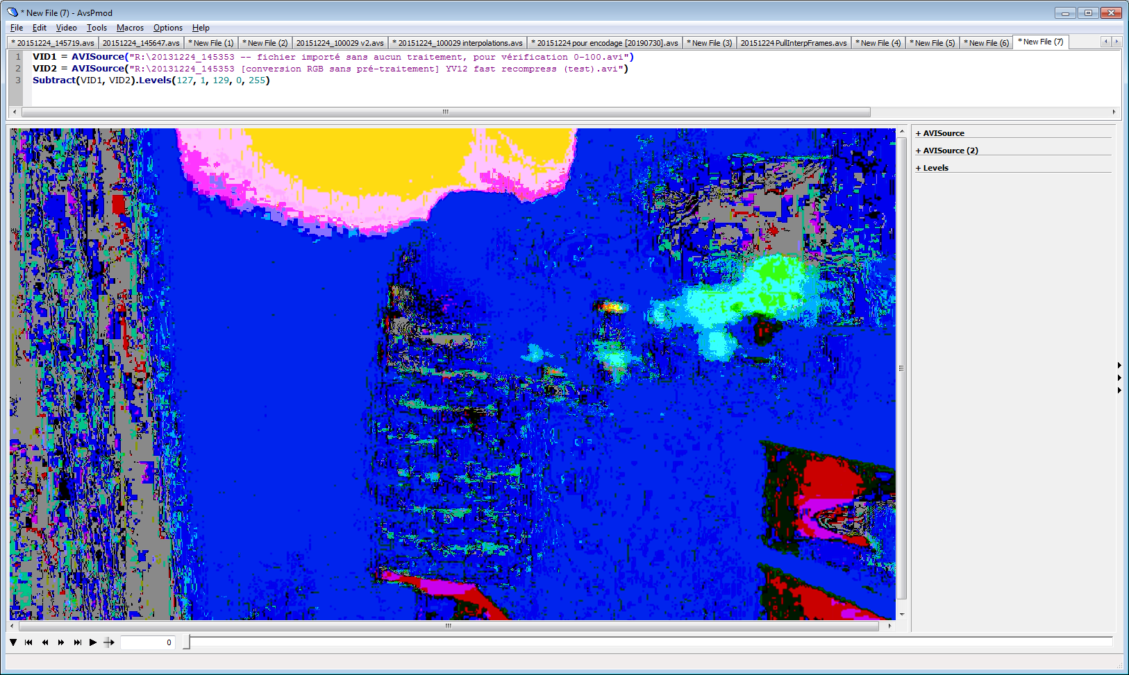 Code:VID1 = AVISource("[direct Lagarith conversion 100 frames sample].avi").ConvertToRGB(matrix="Rec709") VID2 = AVISource("[2020-01-20 Lagarith RGB conversion].avi").Trim(0,100) Subtract(VID1, VID2).Levels(127, 1, 129, 0, 255)