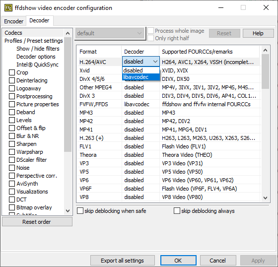 virtualdub2 is easier and updated ffdshow has not been updated since 2014.