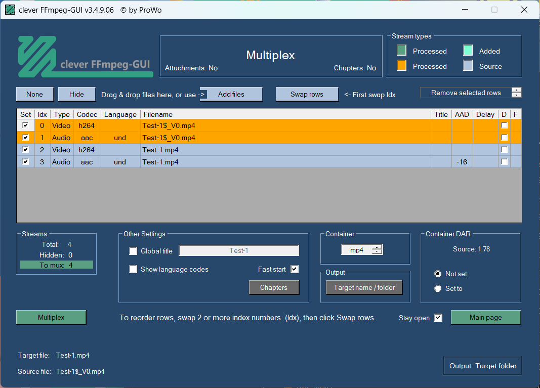 When you use and run "All Streams" as a batch task, the Mux page opens and all streams of the created finished file are displayed as processed streams.