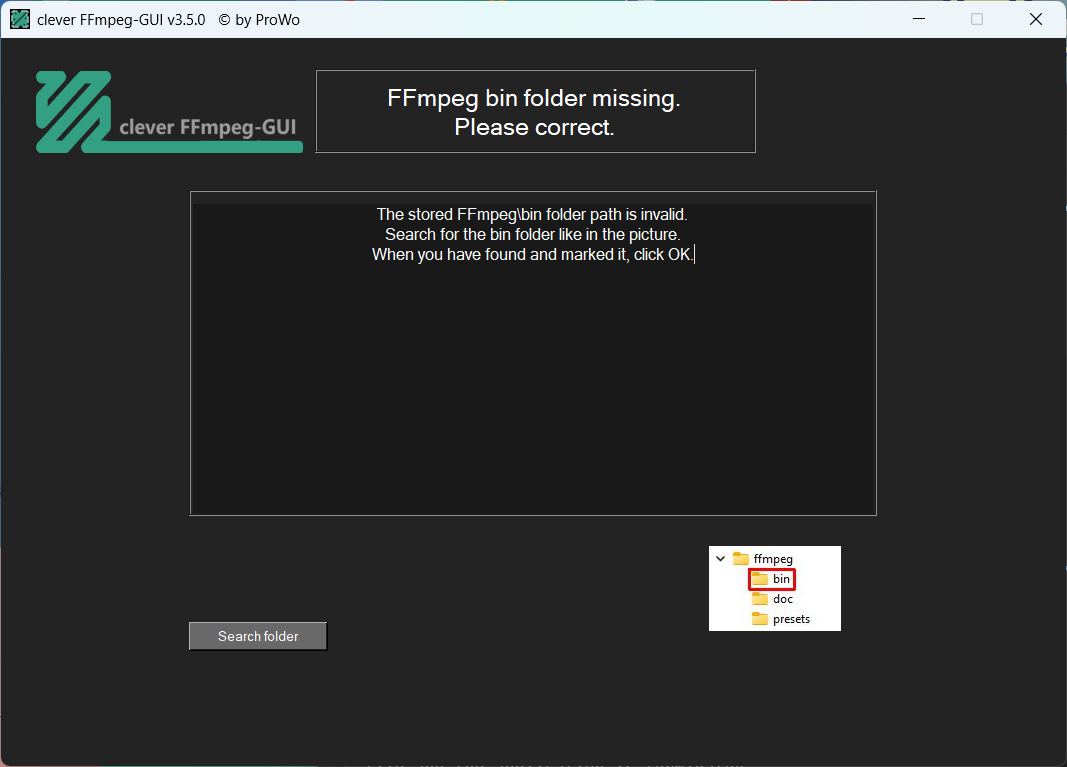 When you change the ffmpeg path and lauch the app, you get this "FFmpeg bin folder missing" window: