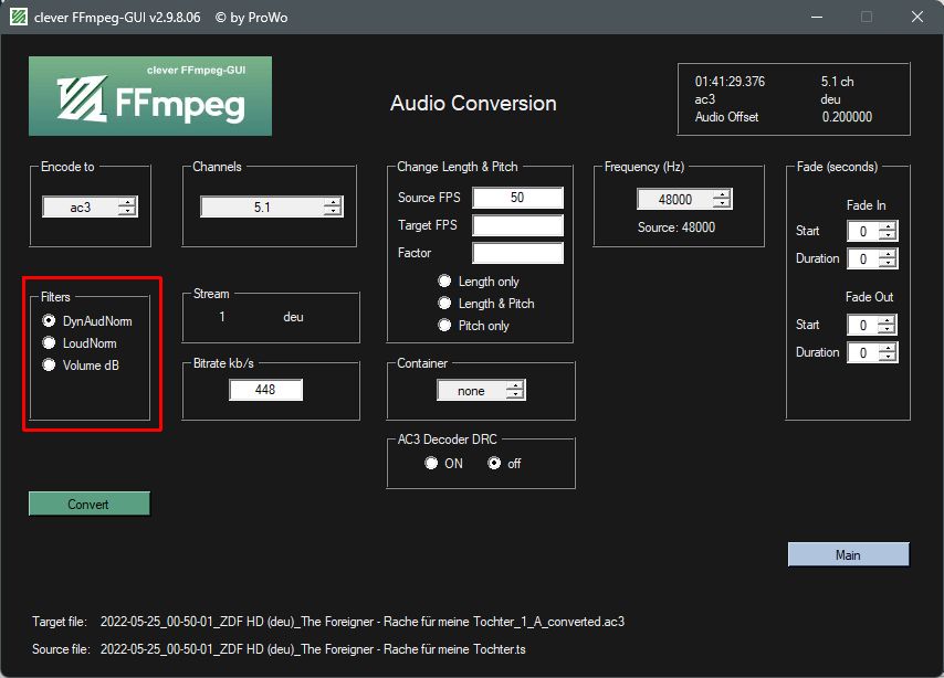 So you select Audio stream convert (you want to change the audio stream), click go to the encoder, click DynAudNorm, leave all other settings as they are and click convert.