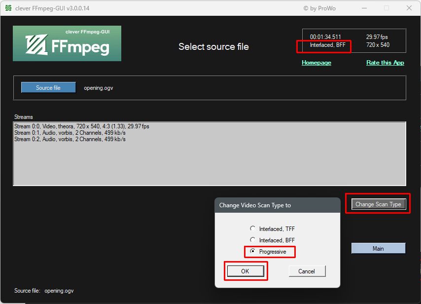 The video you want convert is opening.ogv. Load this file in clever FFmeg-GUI, a message will appear that the scan type was not found. Click yes, the scan type analysis will be done and as result the analysis find Interlaced, BFF (wrong), confirm with yes.