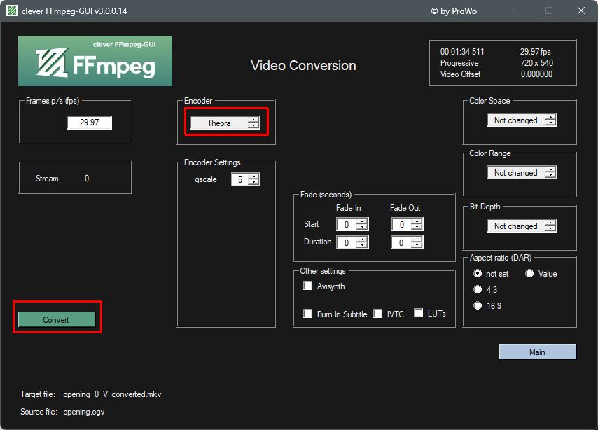 Then click main, click convert VideoStream, click Keep size, select Theroa as encoder, leave all other settings as they are, click convert.