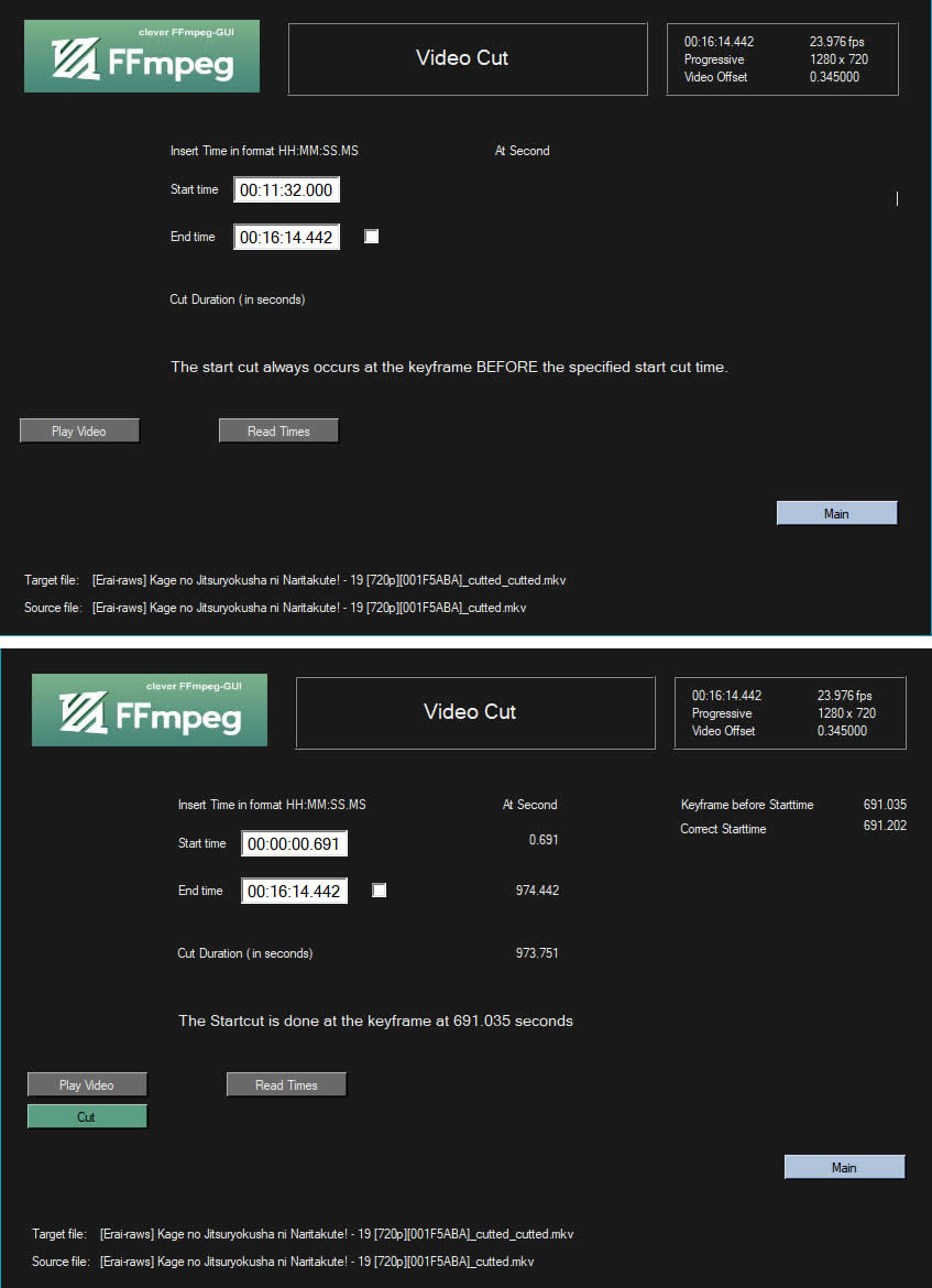 There is nothing I can do to make it use the "00:11:32.000" input, because if I change the Start time again to correct it, it hides the Cut button and makes me run Read Times again, which just does exactly the same thing. And as stated above, using the Cut button cuts it at the bad Start time it's re-written my start time as, not the 00:11:31.035 keyframe it calculated that I asked for.