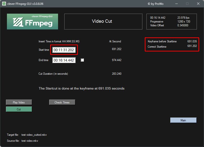 I enter "00:11:32.000" as the Start time. I click "Read Times" and there is a brief flash in the "At Second" readout where it says 692.0 (the value I input, but in seconds), it then flashes up the "Keyframe before Starttime" value as 691.035 and the "Correct Starttime" as 691.202 (all good so far), but then the "At Second" value changes on its own to 0.691 (one thousandth of the time for the correct keyframe), and the "Start time" field changes on its own to copy that value into itself as "00:00:00.691". The "Keyframe before Starttime" stays displaying 691.035 and the "Correct Starttime" stays displaying 691.202, but if I click Cut those change again to match the newly assigned Start time field value/At Second value and the actual cut that occurs aligns with the 0.691 seconds value, not with the 691.035 seconds value.