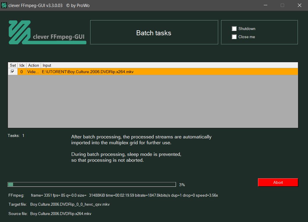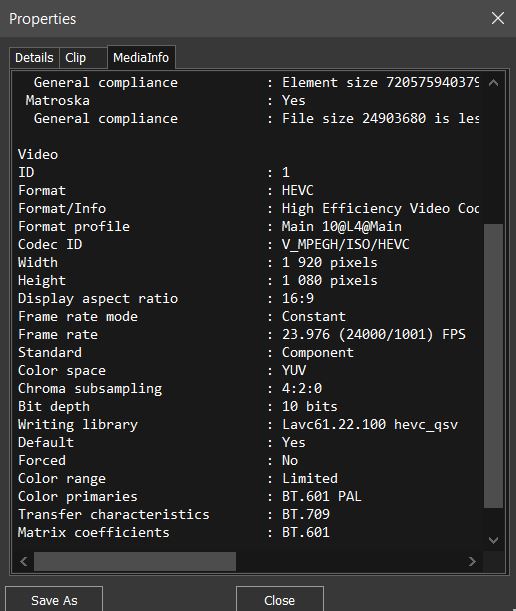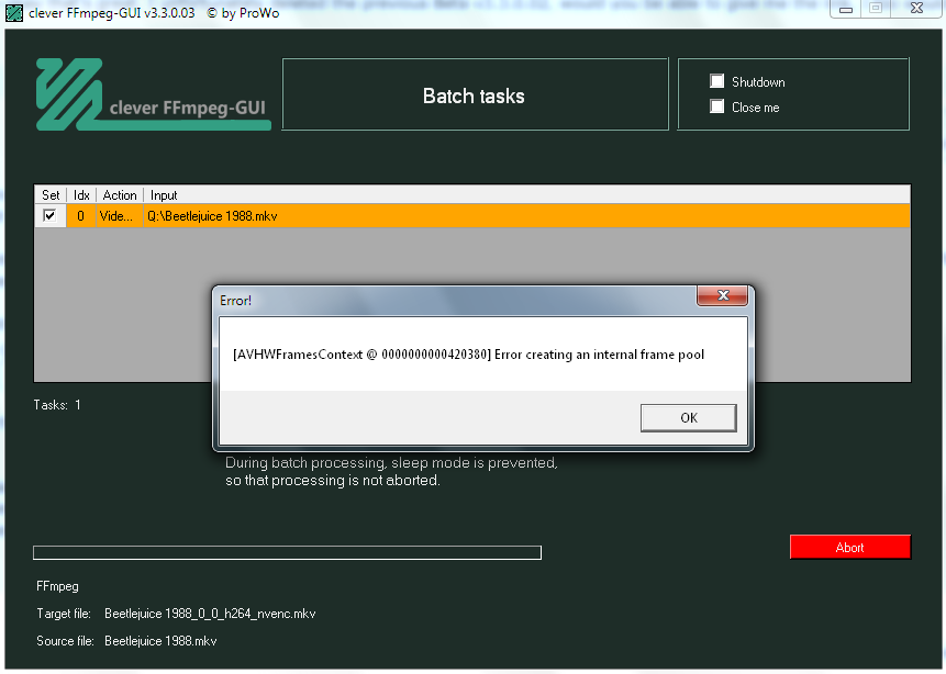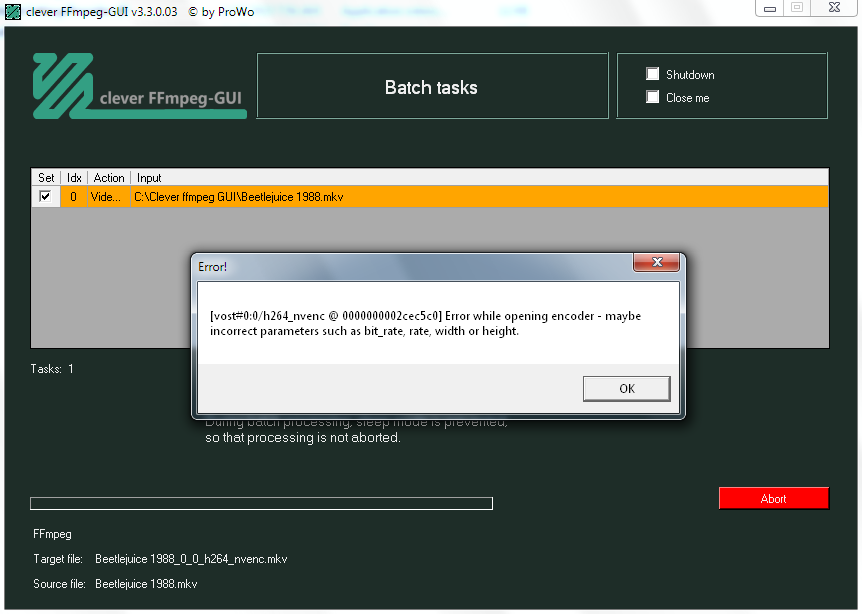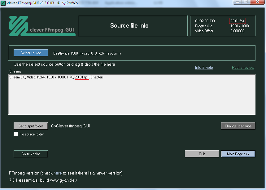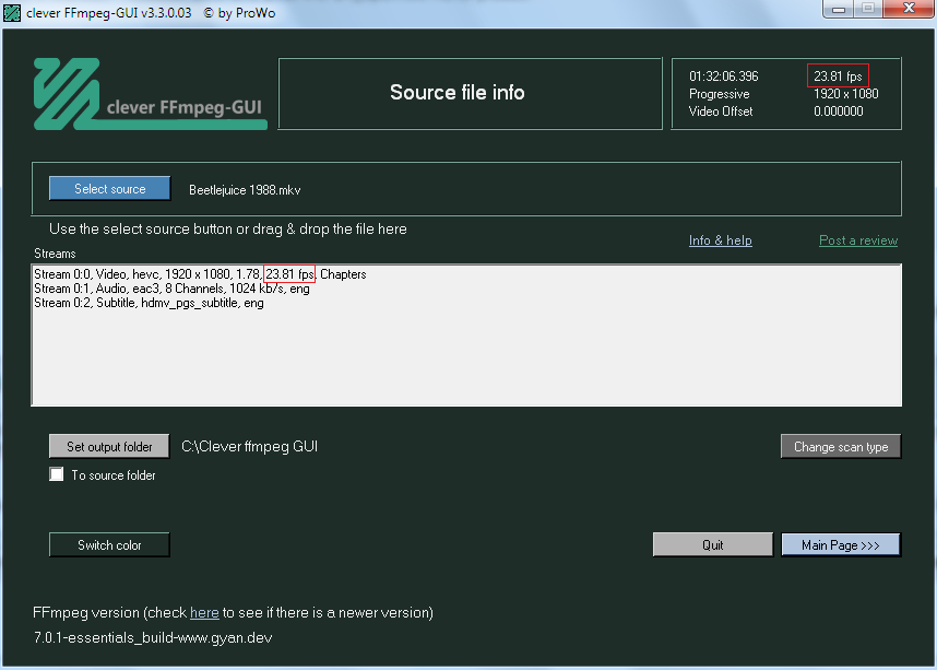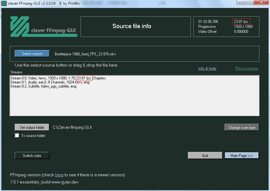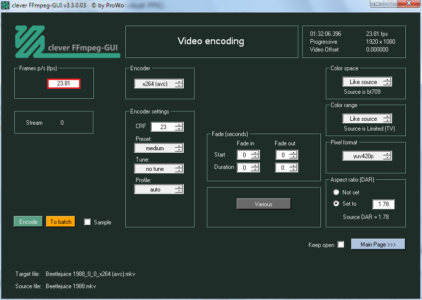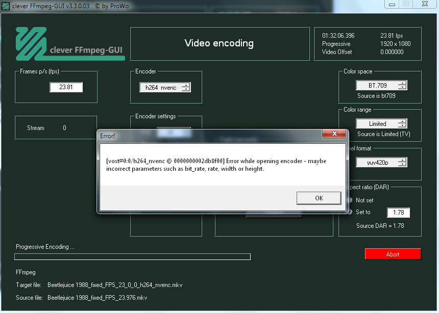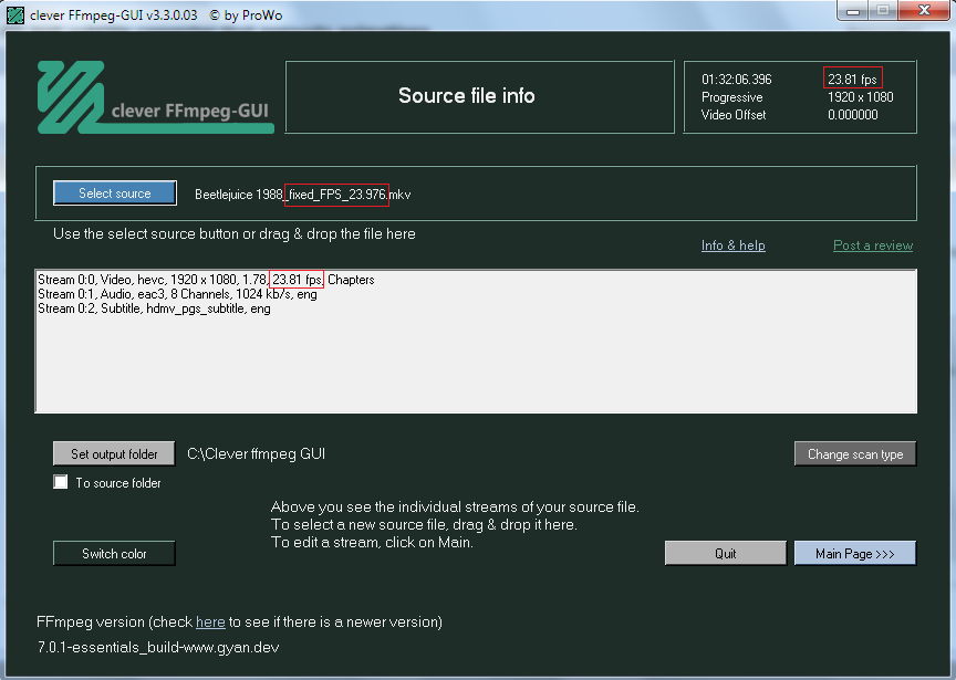 Also I don't think the Fix Framerate option corrected this file as it was 23.81 fps & I fixed it to 23.976 fps, the process completed successfully but it still shows as 23.81 fps, MediaInfo reports it as 23.976 (24000/1001).Video ---> h264_nvenc - Stream ID 0 from ?C:\Clever ffmpeg GUI\Beetlejuice 1988.mkv?5526396?-hide_banner -loglevel error -stats -y -fflags +genpts -i "C:\Clever ffmpeg GUI\Beetlejuice 1988.mkv" -vf fps=23810/1000 -map 0:0 -c:v h264_nvenc -preset medium -global_quality 25 -an -sn -dn -metadata:g encoding_tool="clever FFmpeg-GUI" ?C:\Clever ffmpeg GUI\Beetlejuice 1988_0_0_h264_nvenc.mkv?1