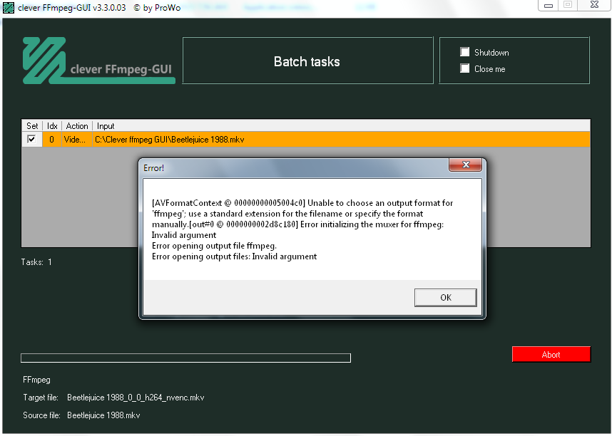 Create a new BT_open.txt in your target folder.Code:Video ---> h264_nvenc - Stream ID 0 from?C:\Clever ffmpeg GUI\Beetlejuice 1988.mkv?5526396?-hide_banner -loglevel error -stats -y -fflags +genpts -i "C:\Clever ffmpeg GUI\Beetlejuice 1988.mkv" -map 0:0 -c:v h264_nvenc -cq 25 -an -sn -dn -metadata:g encoding_tool="clever FFmpeg-GUI"?C:\Clever ffmpeg GUI\Beetlejuice 1988_0_0_h264_nvenc.mkv?1