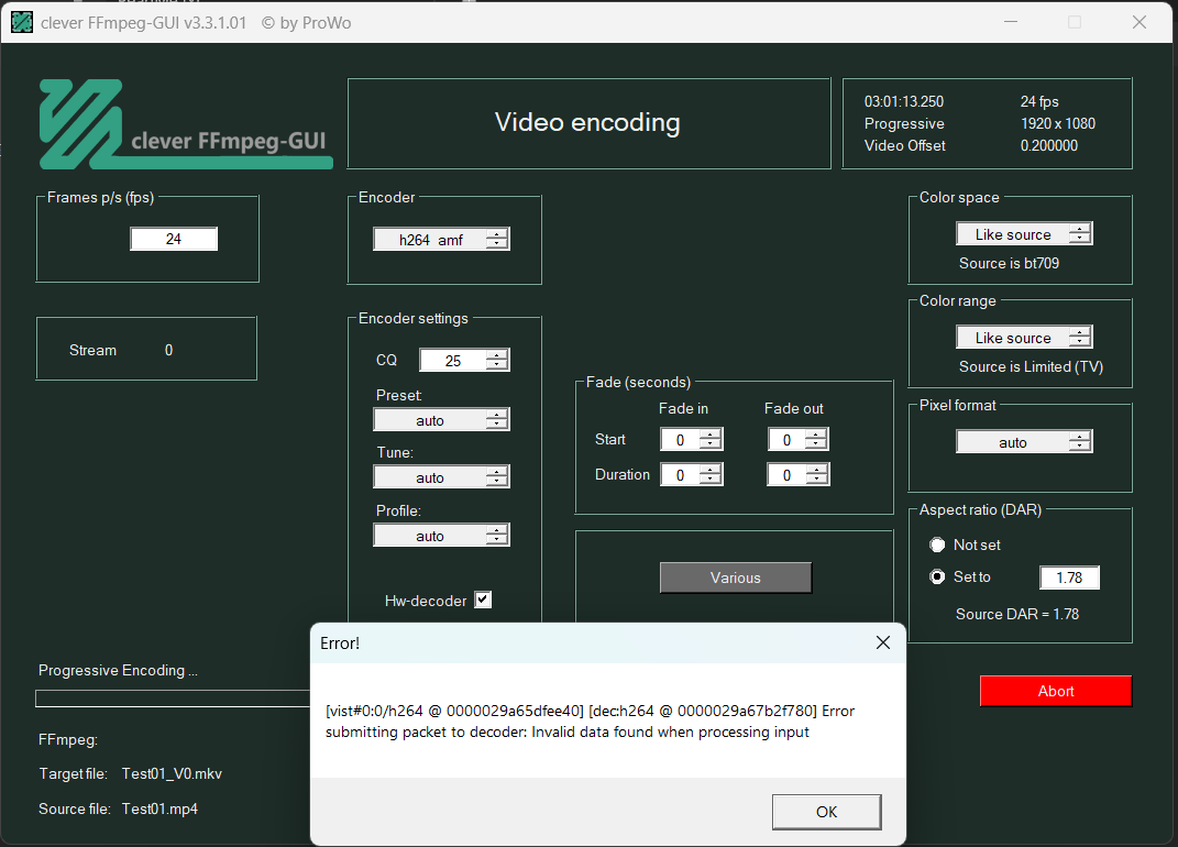 Video ---> h264_amf - Stream ID 0 from?C:\Users\Findu\Downloads\film\Test_01.mkv?179 8327?-hide_banner -loglevel error -stats -y -fflags +genpts -i "C:\Users\Findu\Downloads\film\Test_01.mkv" -vf fps=24000/1001,format=yuv420p -map 0:0 -c:v h264_amf -profile:v high -qvbr_quality_level 23 -rc hqvbr -color_range tv -an -sn -dn -metadata:g encoding_tool="clever FFmpeg-GUI" ?C:\Users\Findu\Downloads\Test_01_V0.mkv?1