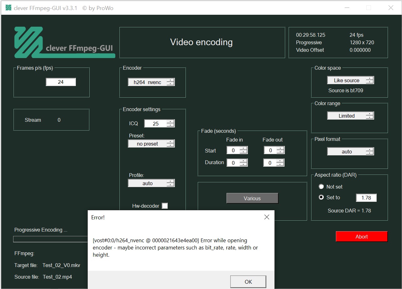Video ---> h264_nvenc - Stream ID 0 from?M:\Test_02.mp4?1798125?-hide_banner -loglevel error -stats -y -fflags +genpts -i "M:\Test_02.mp4" -vf fps=24000/1000 -map 0:0 -c:v h264_nvenc -cq 25 -color_range tv -an -sn -dn -metadata:g encoding_tool="clever FFmpeg-GUI" ?M:\Test_02_V0.mkv?1 -