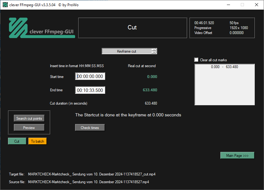 i have a problem while cutting. I try to cut a mp4 file which i have downloaded from a mediathek. I insert cutting time an d perform a check. all fine. I press cut and cleverffmpeg says after ~1 secound task succesfully completed but the file has zero bytes. i tryd different versions of clever and different versions of ffmpeg.