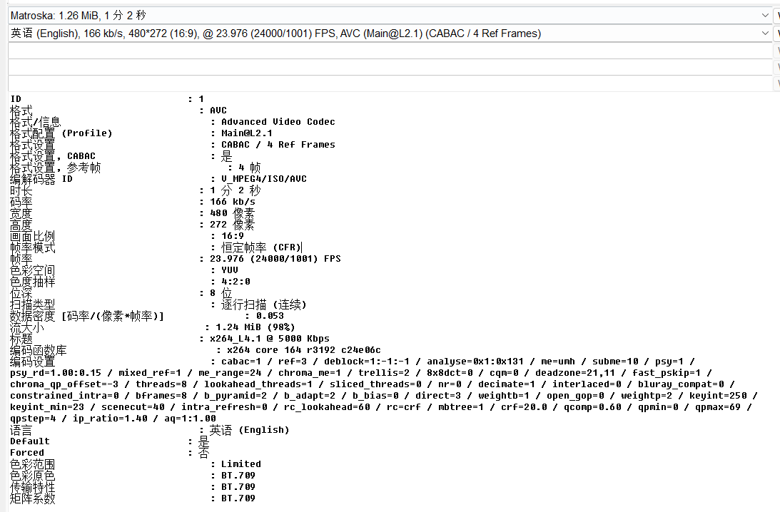 fps=24000/1001,scale=480:204,pad=480:272:0:32,colorspace=all =bt709:iall=bt709:range=tv,format=yuv420p -map 0:0 -c:v libx264 -profile:v main -preset veryslow -tune film -crf 20 -aspect 1.76 -an -sn -dn -x264-params ref=3 -metadata:g encoding_tool="clever FFmpeg-GUI"