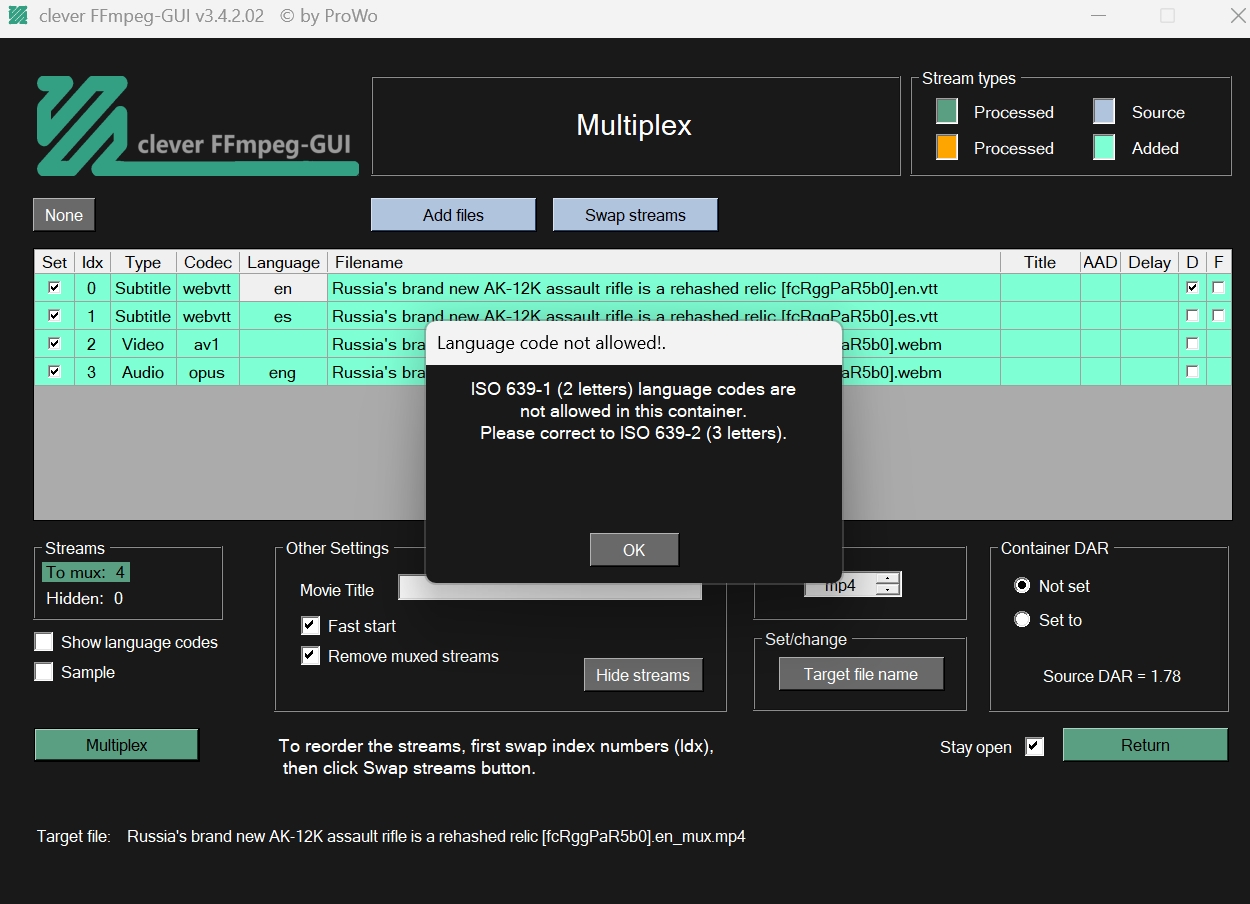Then I updated to latest beta. Now there are language codes but the streams are not cleared again. Yes, I made sure all the streams are checked before muxing.