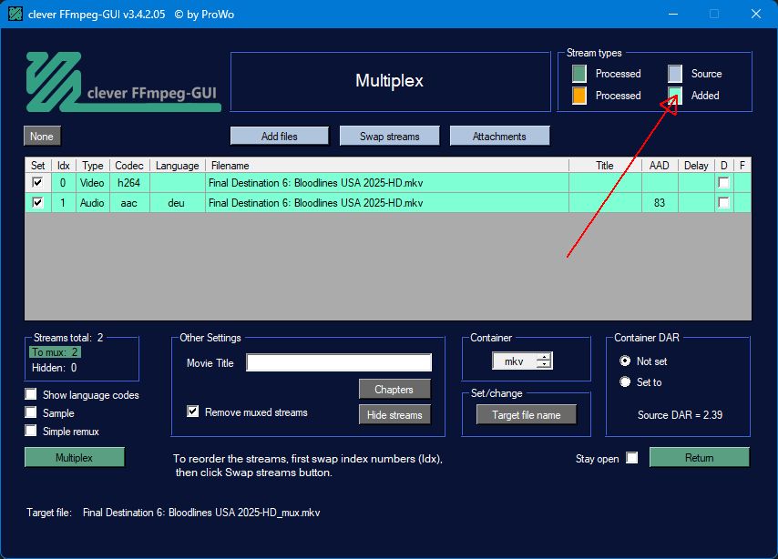 I don't know why that picture I posted didn't show the "hook". But the file was hooked and muxed. The streams didn't clear. I have tried more files with same results of no streamed clear. Since I use this app mainly to mux subtitles, I am back to using an older version that I am happy with.