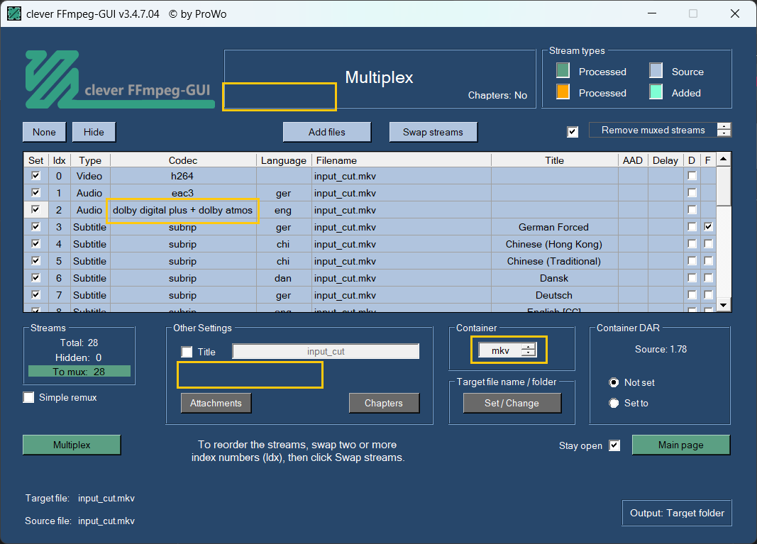 When you open the Mux page, the information text “Attachments: No” is visible if your container is mkv. If this is not the case and you have to change the container to mkv, this information will not be displayed.