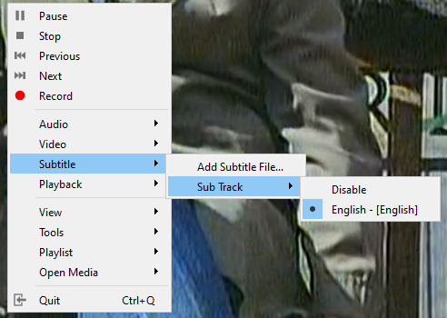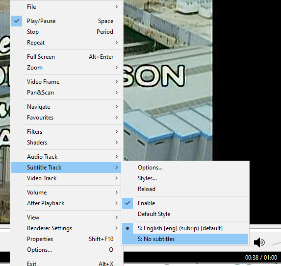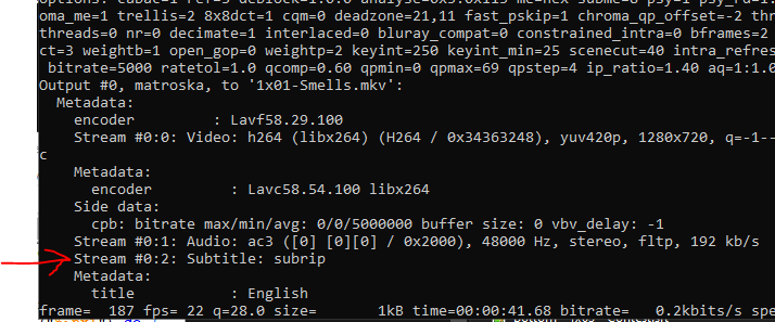 Removing theCode:ffmpeg -i "filename.avs" -i "filename T80 2_0ch 192Kbps DELAY 0ms.ac3" -ac 2 -i "filename.srt" -metadata:s:s:0 language=eng -metadata:s:s:0 title="English" -map 0:v -map 1:a -map 2:s -c:v libx264 -profile:v high -pix_fmt yuv420p -b:v 5000k -preset slow -bf:v 2 -rc vbr_hq -rc-lookahead 32 -movflags +faststart -c:a copy -scodec copy -t 60 "output.mkv"gets rid of [English] in VLC and the [eng] in MPC, but I still have "(subrip)" in MPC.Code:-metadata:s:s:0 language=eng