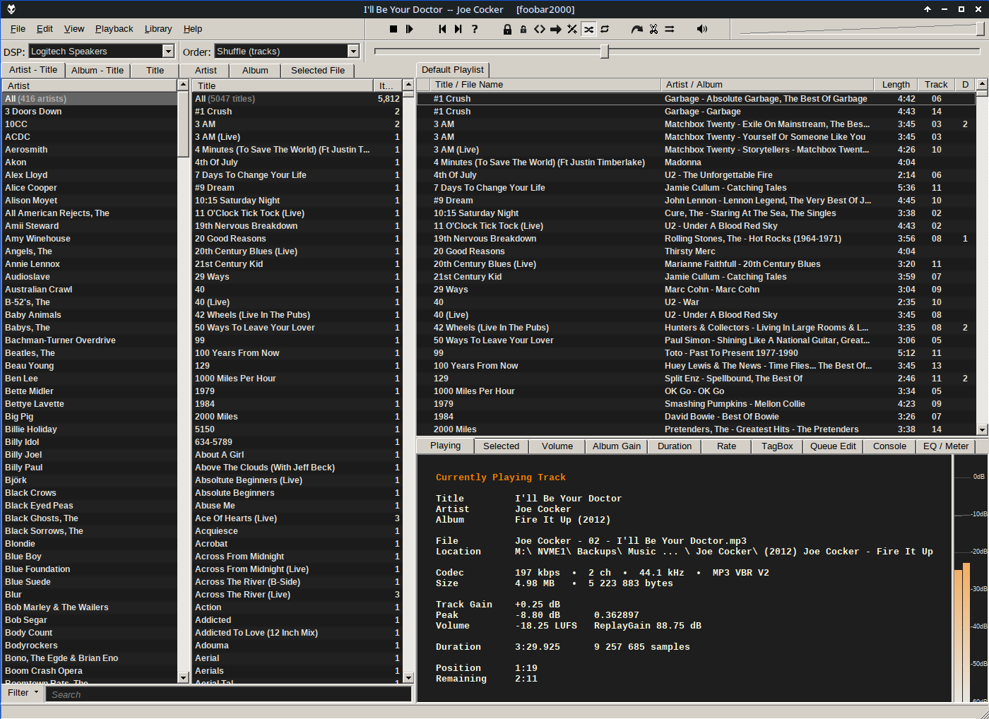 You only need to extract the zip file somewhere and run foobar2000.exe. It's setup to be both an audio player and a converter (I use it for the latter almost daily). It's a "business only" configuration. It doesn't display album art or visualizations etc (aside from the output meters), but it displays a fair bit of information about audio files. It's configured for a 4:3 display, so you can run it on a wider display without it hogging the whole screen, or you can run it fullscreen and resize the various sections of the GUI. The left side of the GUI is dedicated to displaying your media library and won't display anything unless you tell fb2k where to find it. The right side of the GUI has tabs at the top for displaying playlists, and tabs below for displaying information about the files in those playlists.